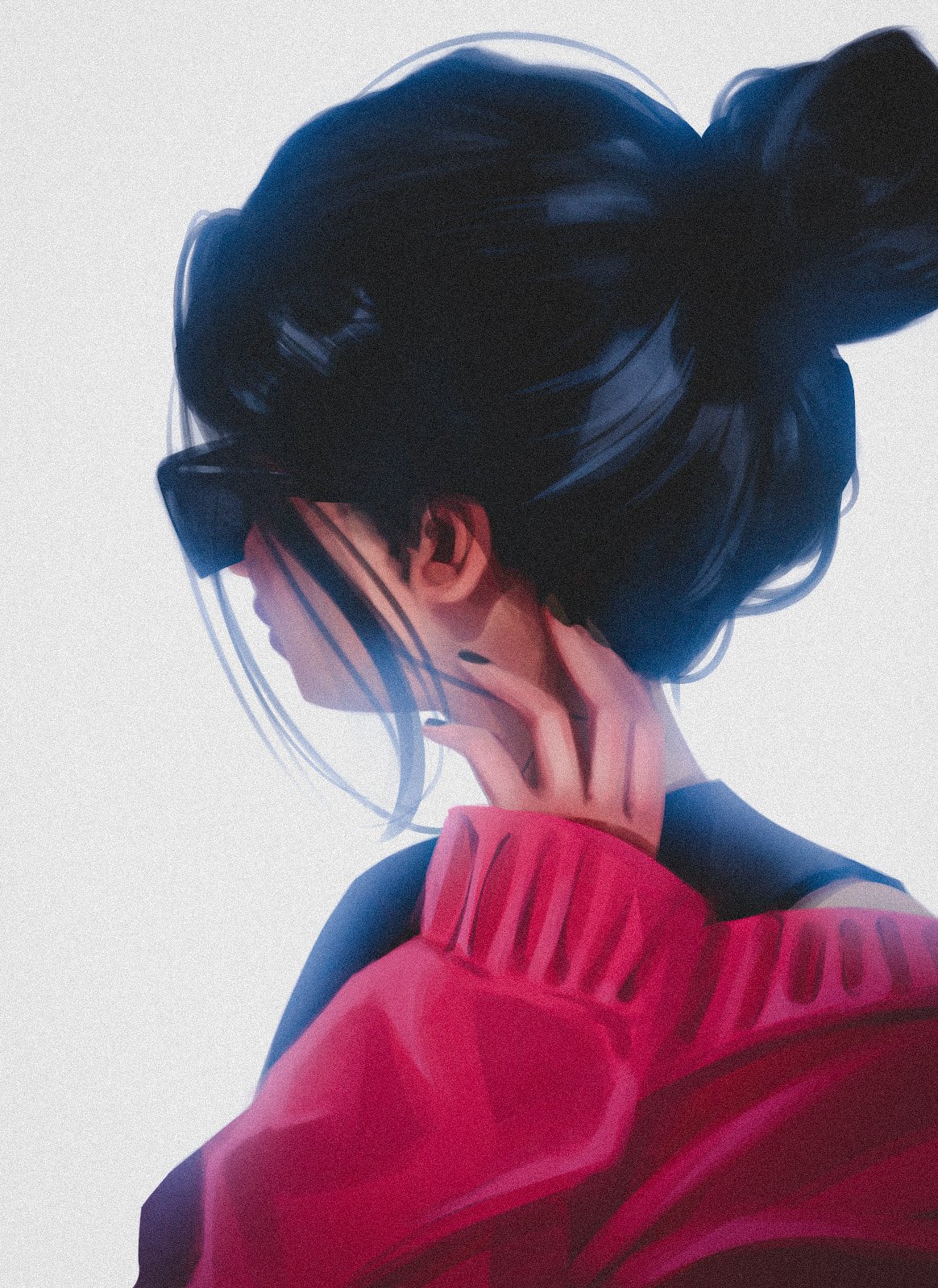 1girl black_hair black_nails black_shirt facing_away fingernails hair_bun hand_on_own_neck hashtag-only_commentary highres long_sleeves nail_polish original red_sweater shirt short_hair simple_background single_hair_bun solo sunglasses sweater titanartx upper_body white_background