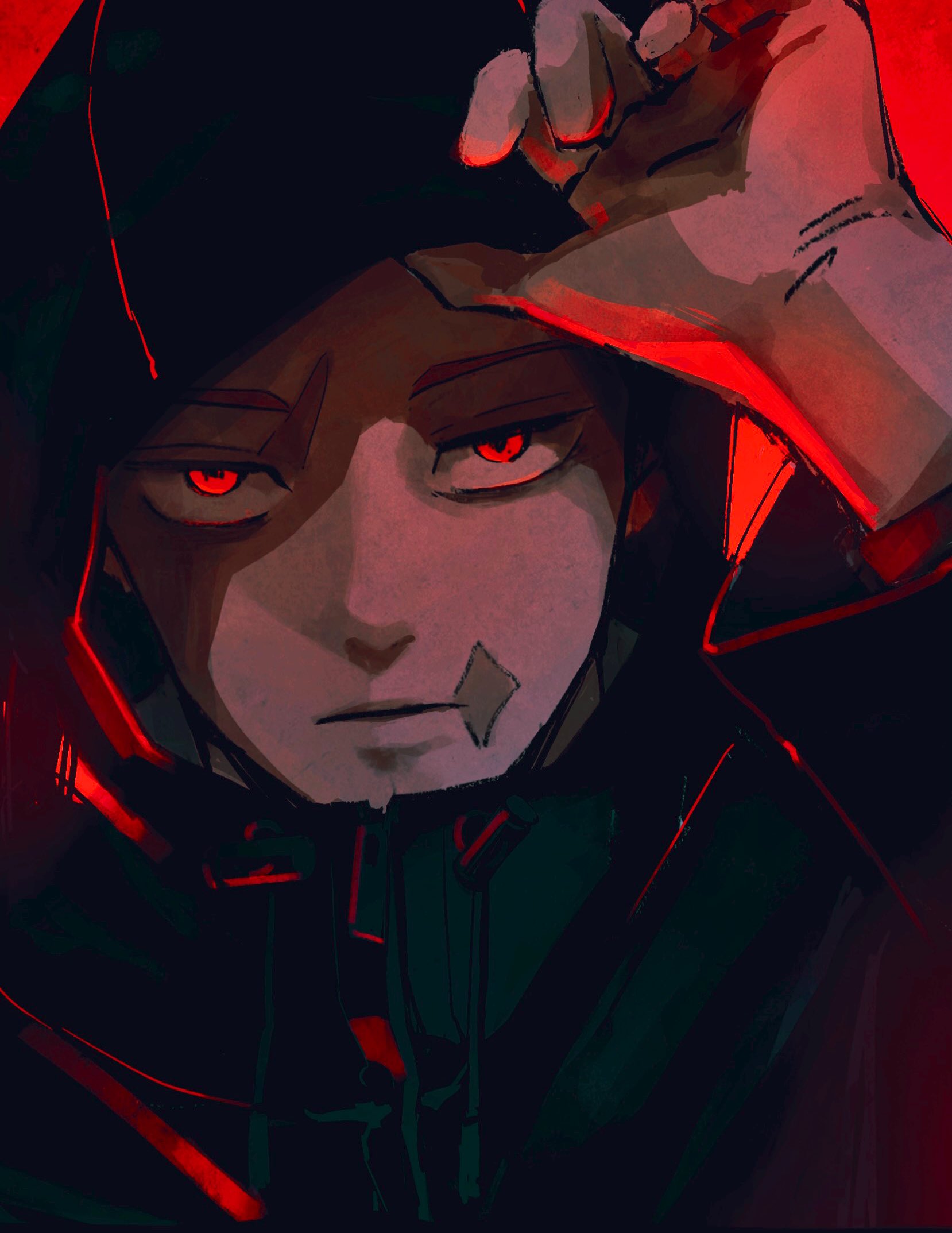 1boy 28cg adjusting_hood black_jacket highres hood hood_up hooded_jacket itadori_yuuji jacket jujutsu_kaisen looking_at_viewer male_focus red_background red_eyes scar scar_on_face scar_on_mouth solo