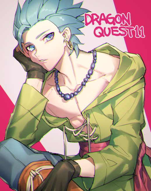 1boy aqua_hair bead_necklace beads black_gloves blue_eyes boots brown_boots camus_(dq11) collarbone commentary_request copyright_name dragon_quest dragon_quest_xi earrings fingerless_gloves gloves green_jacket grey_pants hair_slicked_back head_on_hand hoop_earrings jacket jewelry jou_(mono) male_focus necklace pants parted_lips pink_background short_hair solo