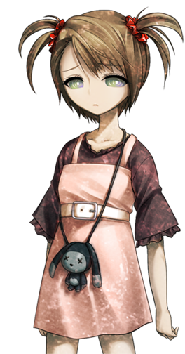 1girl aqua_eyes bare_legs blouse blue_eyes brown_hair child dress game_cg hair_tie huke looking_at_viewer narrowed_eyes official_art pinafore_dress pink_dress pink_shoes purple_shirt sad science_adventure shirt shoes short_twintails sidelocks sleeveless sleeveless_dress sneakers solo sprite steins;gate stuffed_animal stuffed_toy tennouji_nae transparent_background twintails x_x