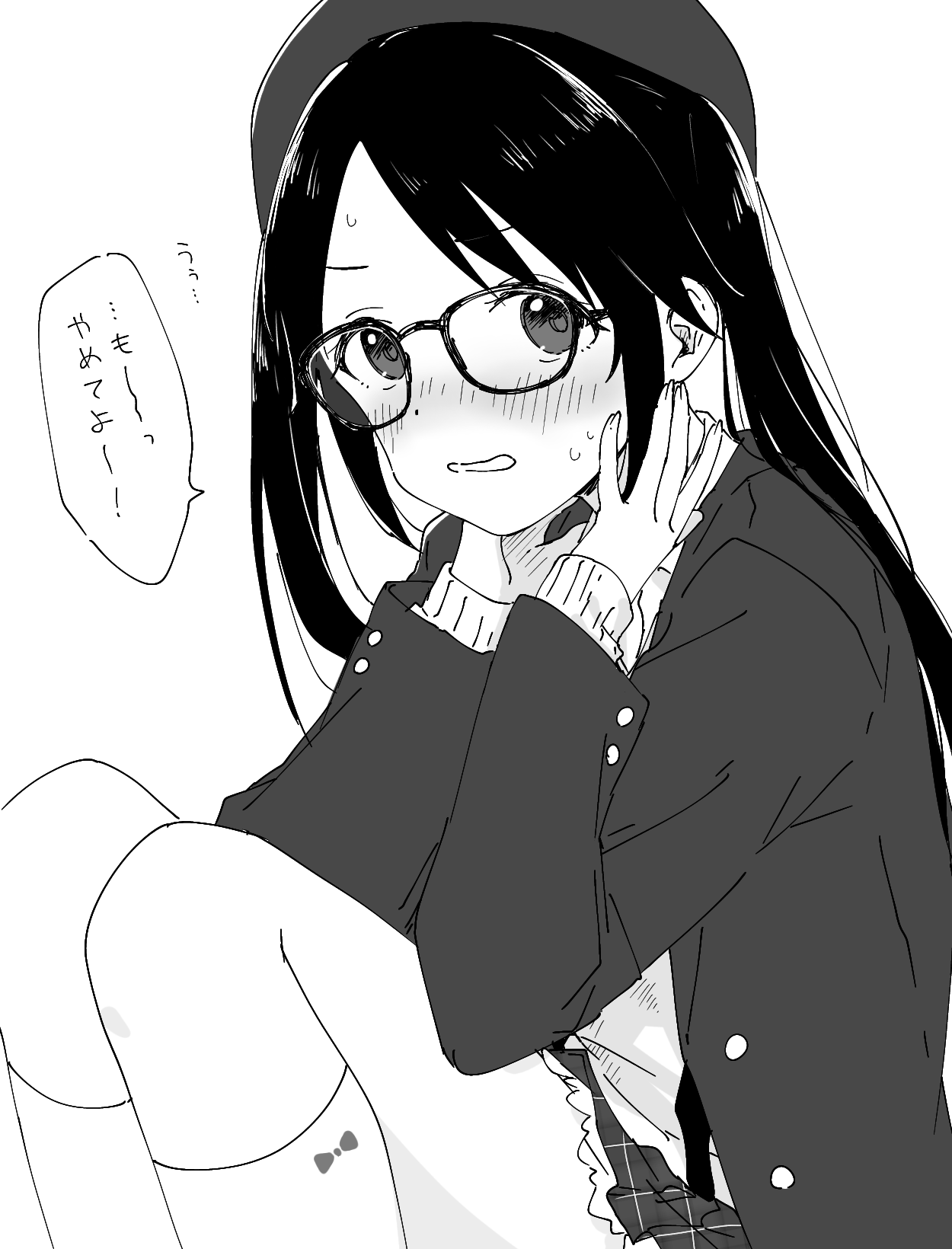 1girl beret black_hair blush bow_print buttoned_cuffs buttons commentary_request embarrassed frilled_skirt frills glasses greyscale hat highres idolmaster idolmaster_shiny_colors jacket long_hair looking_at_viewer mitsumine_yuika monochrome pachiko sitting skirt solo sweatdrop translated twintails