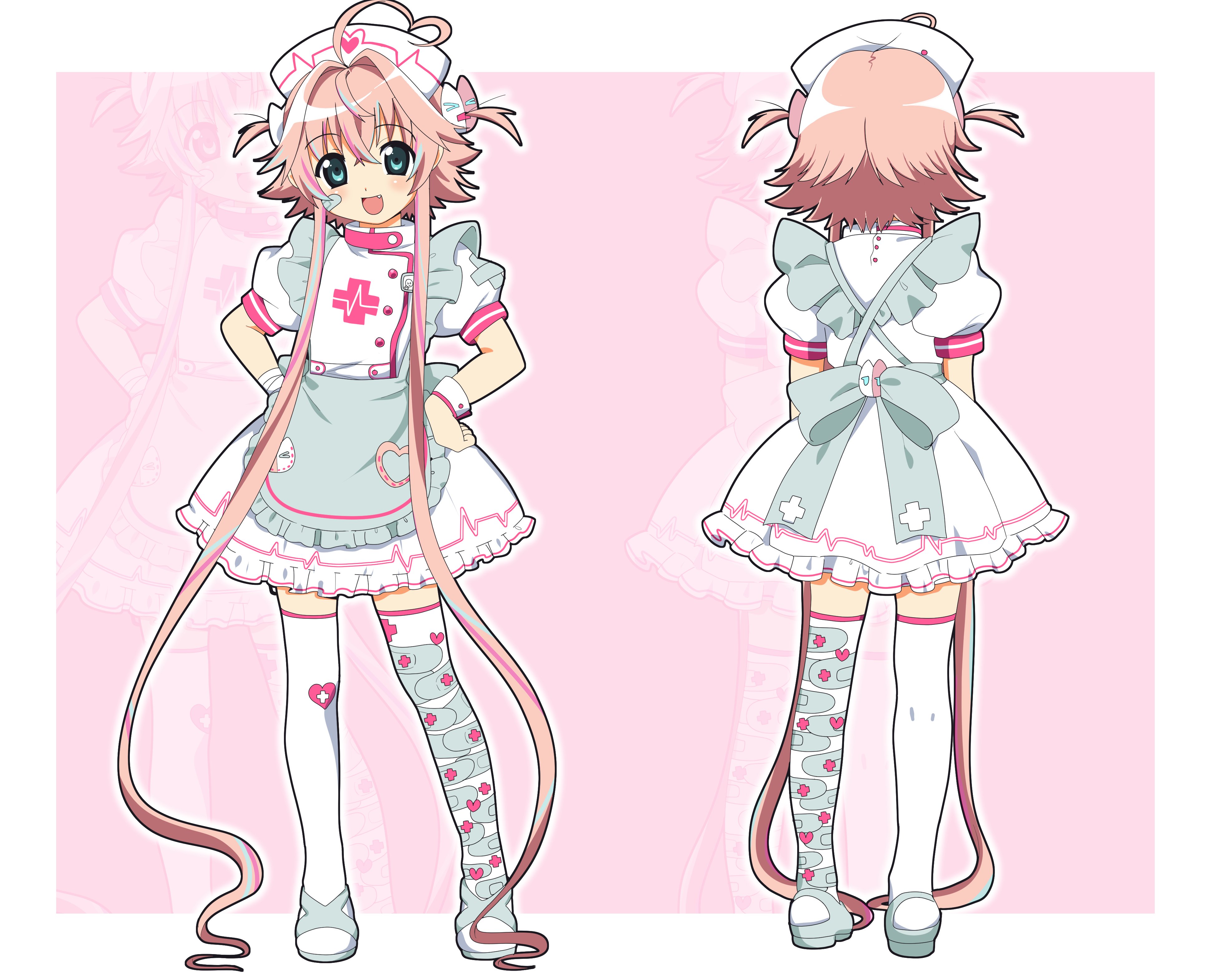 1other 2000s_(style) absurdly_long_hair absurdres ahoge animal_hair_ornament apron back_bow bandaged_arm bandages bandaid bandaid_on_face bandaid_print bk_(barakoodra) blue_eyes blue_streaks border bow buttons commentary commentary_request cross cross_print crossed_bangs dress english_commentary fang frilled_dress frills full_body grey_apron grey_shoes hands_on_own_hips hat heart high_collar highres indie_virtual_youtuber kuzukawa_yume long_hair looking_at_viewer maid maid_apron multicolored_hair multiple_views nurse nurse_cap open_mouth other_focus pink_background pink_hair pink_streaks pink_trim puffy_short_sleeves puffy_sleeves second-party_source shoes short_hair_with_long_locks short_sleeves standing streaked_hair thighhighs turnaround two_side_up unconventional_maid very_long_hair virtual_youtuber white_border white_dress white_thighhighs white_wrist_cuffs wrist_cuffs zoom_layer