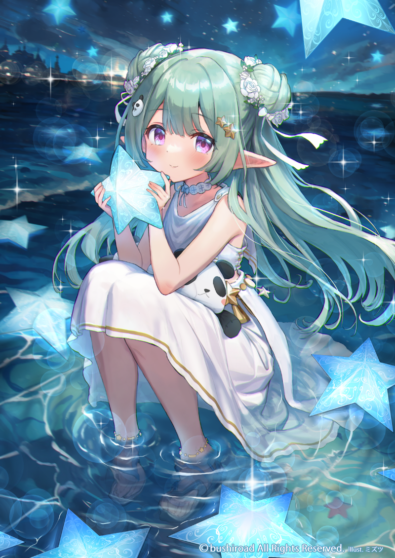 1girl cardfight!!_vanguard commentary_request copyright_notice full_body green_hair hair_ornament long_hair mizutsu official_art outdoors panda_hair_ornament pointy_ears purple_eyes sky soaking_feet solo star_(symbol) star_hair_ornament stuffed_animal stuffed_panda stuffed_toy