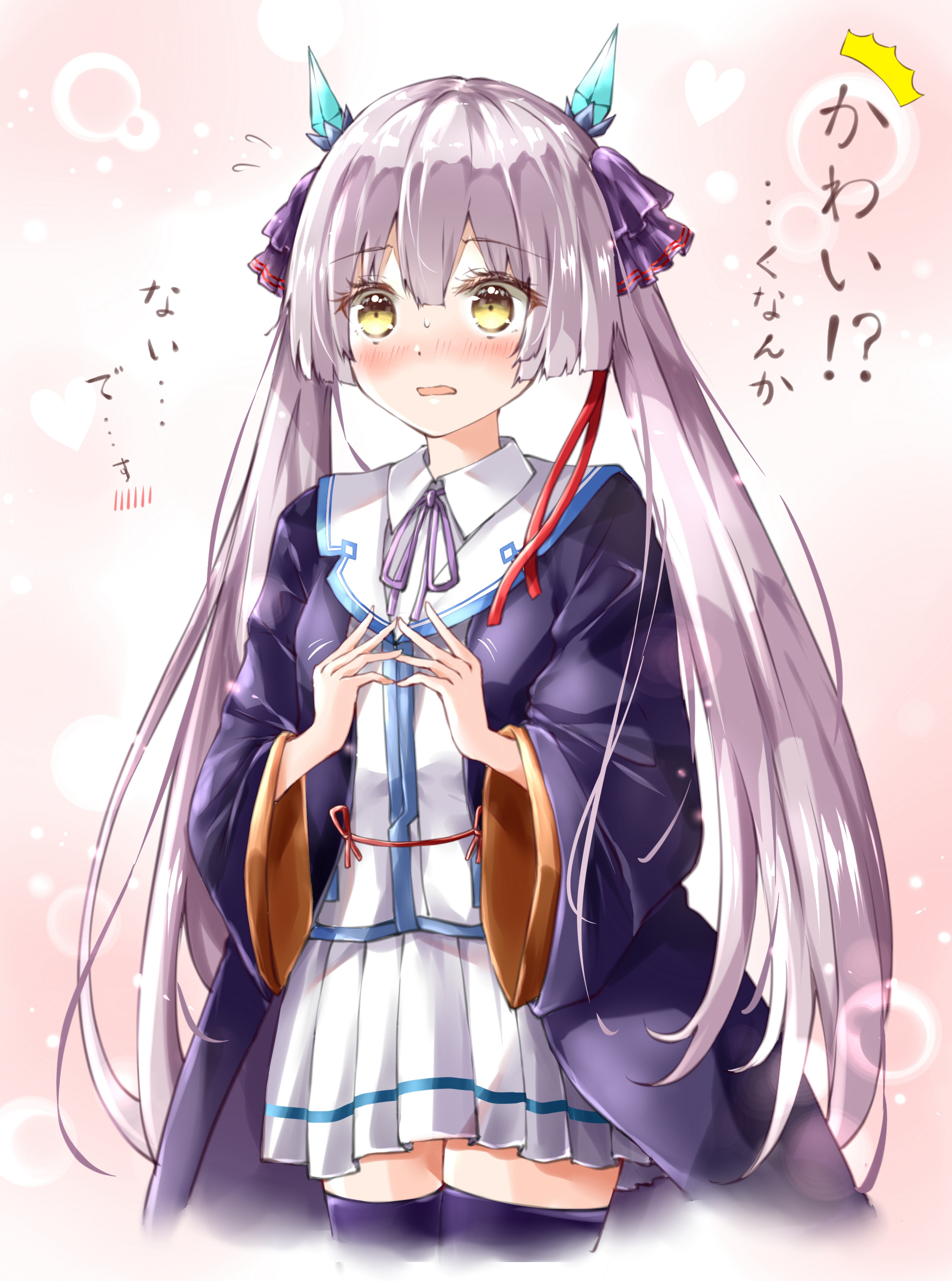 1girl ^^^ absurdres ayaro_(genkiloobaii) black_thighhighs blunt_bangs blunt_ends blush brown_hair collared_shirt commentary_request cowboy_shot cropped_legs embarrassed eyelashes eyes_visible_through_hair fidgeting flying_sweatdrops hair_ribbon hands_up heart heaven_burns_red highres hime_cut long_hair looking_ahead miniskirt motion_lines neck_ribbon nose_blush ogasawara_hisame pink_background pleated_skirt purple_ribbon red_ribbon ribbon shirt sidelocks simple_background skirt solo straight_hair sweatdrop thighhighs translated twintails very_long_hair white_shirt white_skirt yellow_eyes zettai_ryouiki