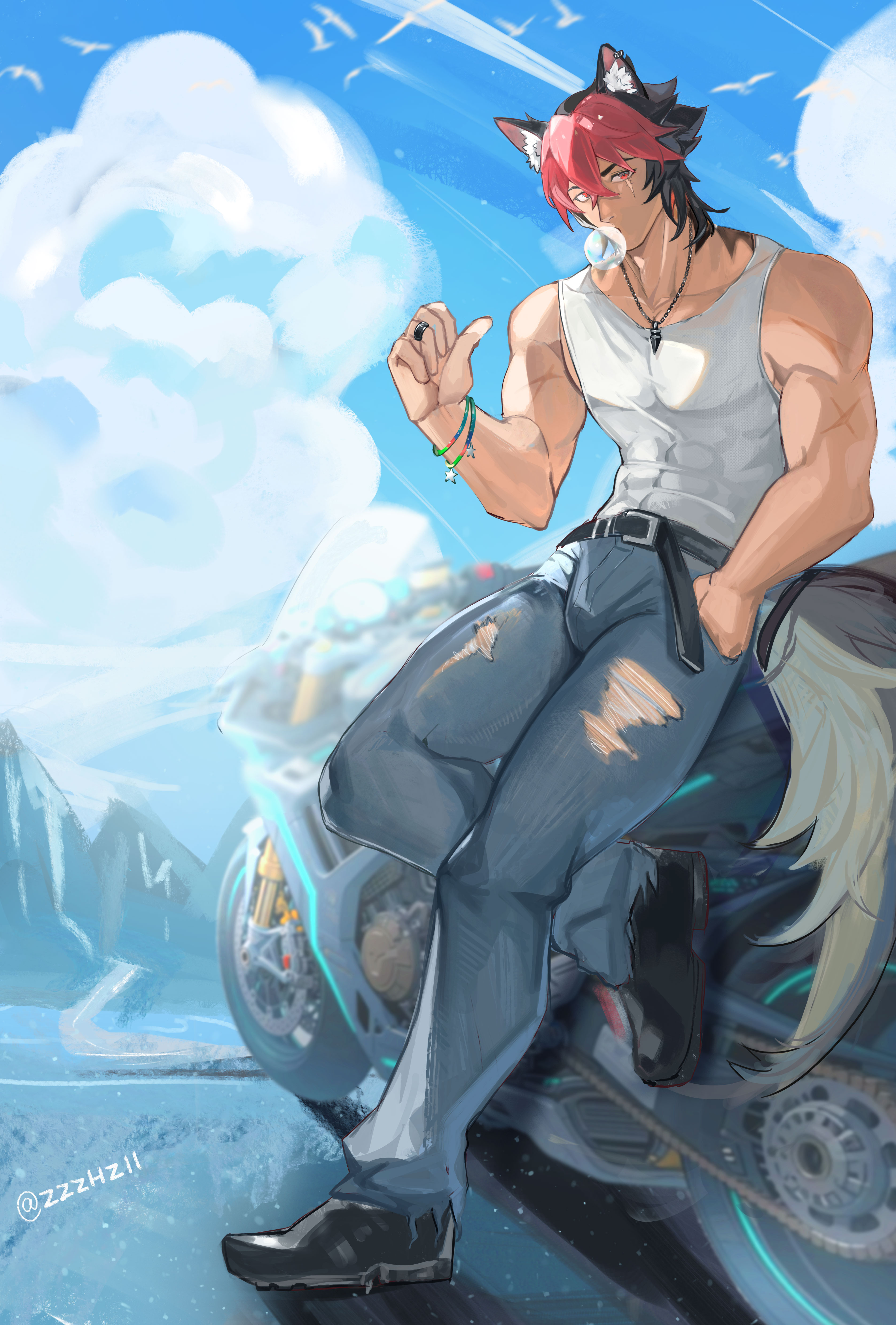 1boy absurdres animal_ears black_pants black_shoes bubble collarbone commentary_request dog_boy dog_ears dog_tail hand_in_pocket highres jewelry komano_manato male_focus motor_vehicle motorcycle multicolored_hair muscular muscular_male necklace pants shoes tail torn_clothes torn_pants xianbei123 zenless_zone_zero