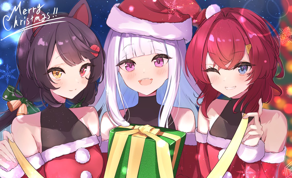 3girls :d alternate_costume ange_katrina animal_ears armpit_crease bare_shoulders bell black_leotard blue_background blue_eyes blue_hair blunt_bangs blurry blurry_background blush bow box christmas closed_mouth collarbone colored_inner_hair commentary_request crossed_bangs dog_ears dress english_text eyelashes fur-trimmed_dress fur-trimmed_headwear fur_trim gift gift_box green_bow grin group_picture hair_bell hair_bow hair_intakes hair_ornament hand_up hat heterochromia holding holding_gift holding_ribbon inui_toko leotard leotard_under_clothes light_particles lize_helesta long_hair long_sidelocks long_sleeves looking_at_viewer low_twintails medium_hair merry_christmas multicolored_hair multiple_girls nijisanji nishiki_yuno one_eye_closed open_mouth polka_dot polka_dot_bow pom_pom_(clothes) purple_eyes raised_eyebrows red_dress red_eyes red_hair red_hat ribbon sanbaka_(nijisanji) santa_costume santa_dress santa_hat sidelocks smile snowflakes swept_bangs teeth twintails two-tone_hair upper_teeth_only virtual_youtuber white_hair yellow_eyes yellow_ribbon