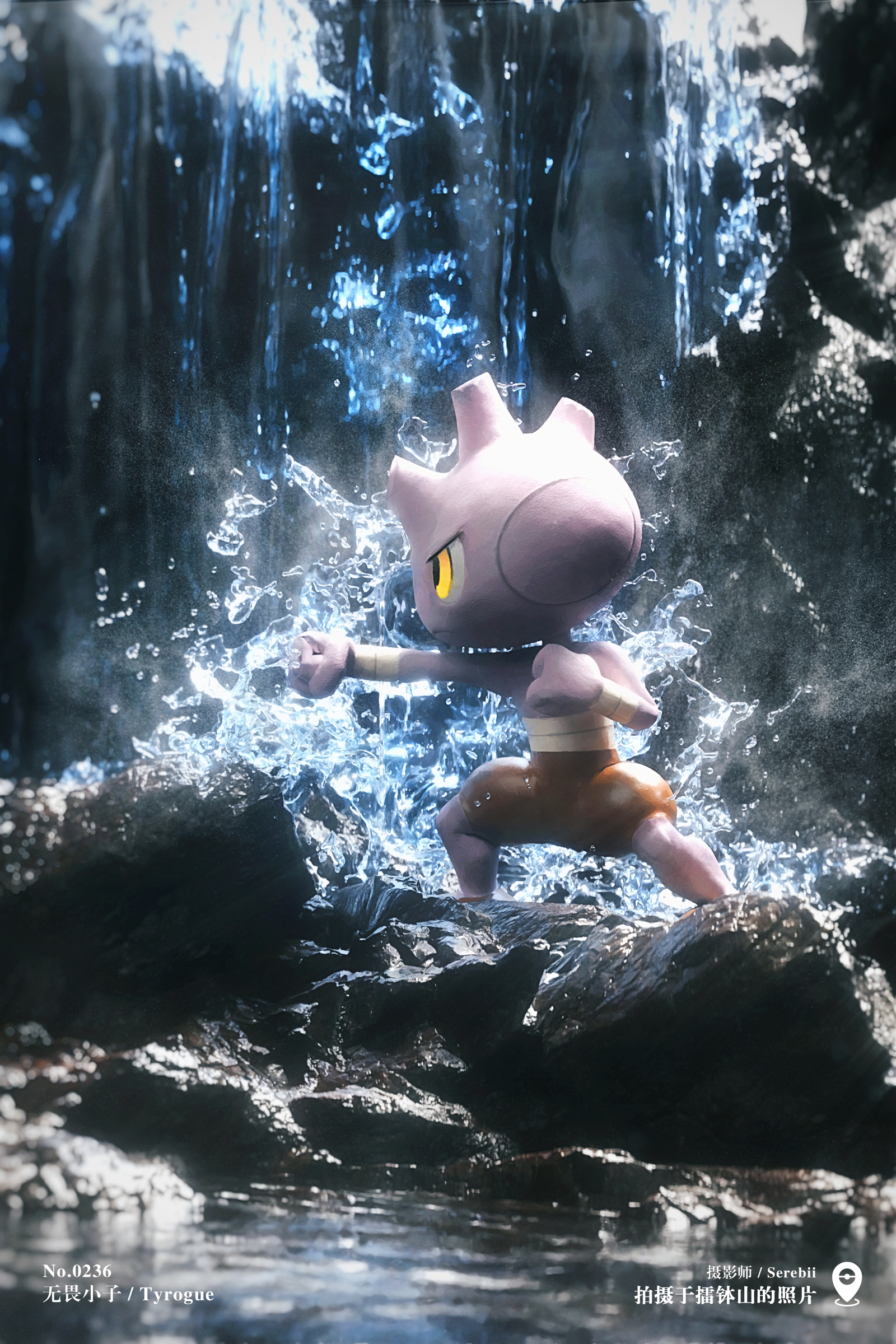 absurdres bandaged_arm bandages celebi350300687 closed_mouth commentary_request gen_2_pokemon highres horns nintendo no_humans pokemon pokemon_(creature) pokemon_focus punching rock splashing tyrogue water waterfall yellow_eyes
