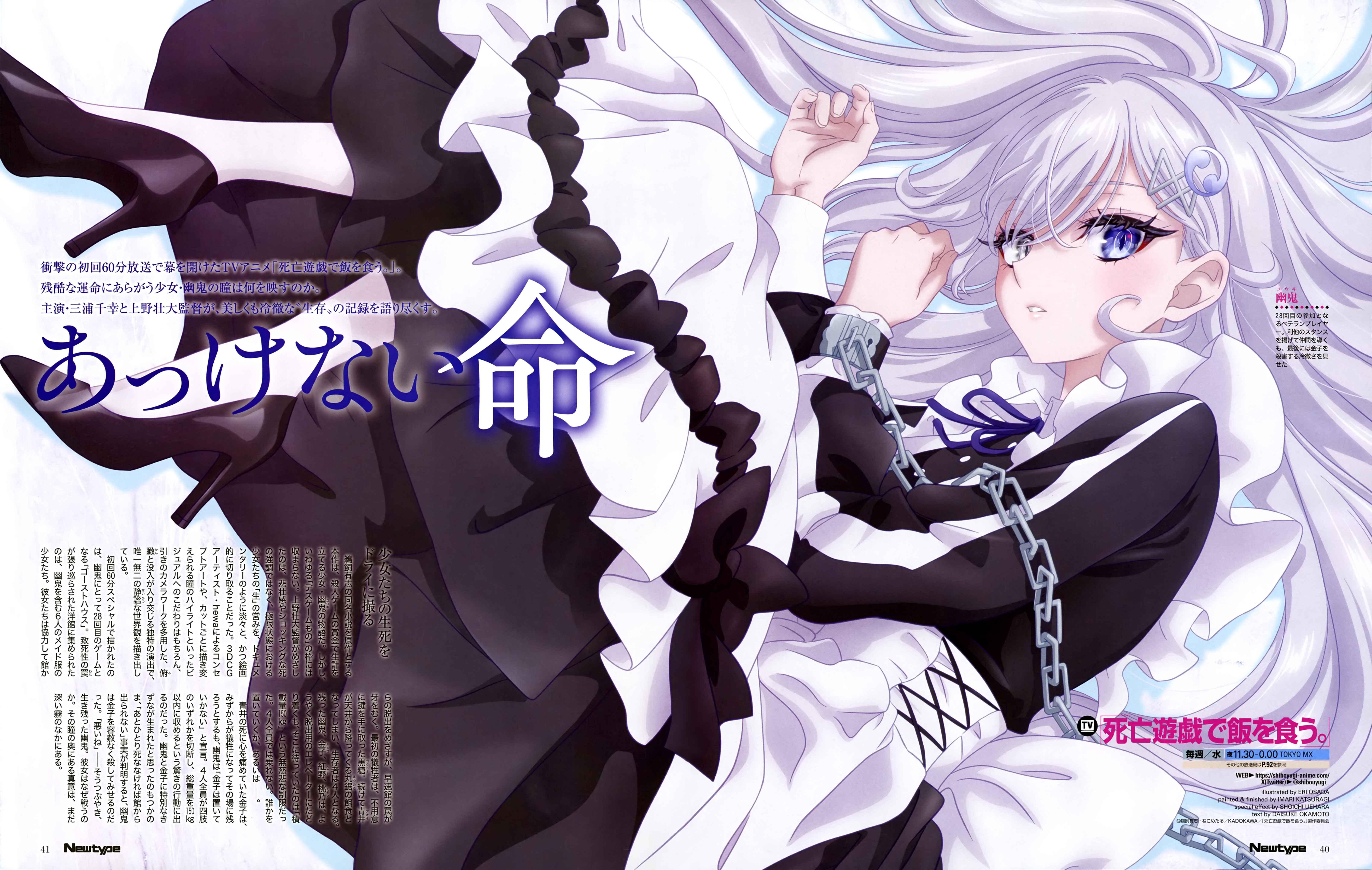 1girl absurdres anime_coloring artist_request blue_eyes blue_ribbon chain chained copyright_name copyright_notice fetal_position frills hair_behind_ear hair_ornament hair_spread_out heterochromia high_heels highres light_blush long_hair long_sleeves looking_at_viewer lying magazine_scan maid neck_ribbon newtype official_art on_side page_number parted_lips pumps ribbon scan shibou_yuugi_de_meshi_wo_kuu. solo stiletto_heels third-party_source translation_request white_eyes white_hair yuuki_(shibou_yuugi)