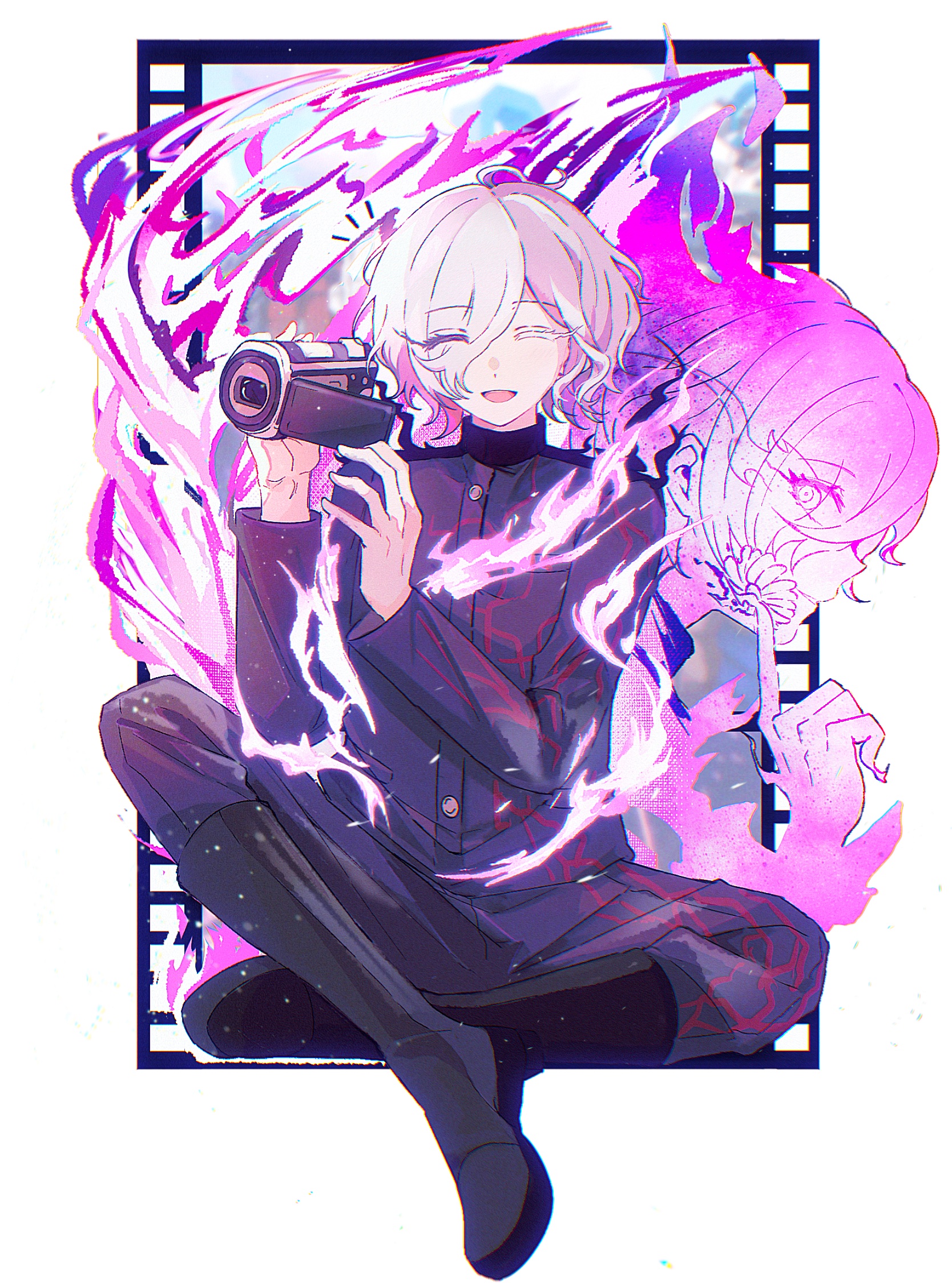 1boy :d ^_^ black_boots black_jacket black_pants boots camcorder camera closed_eyes commentary_request crossed_legs eyes_visible_through_hair facing_viewer fire gakuran glowing_veins hair_over_one_eye highres holding holding_camera jacket long_sleeves male_focus mero_(merope_hika) multiple_views open_mouth pants pink_fire purple_fire school_uniform shion_(hundred_line) short_hair smile the_hundred_line_-last_defense_academy- video_camera white_hair