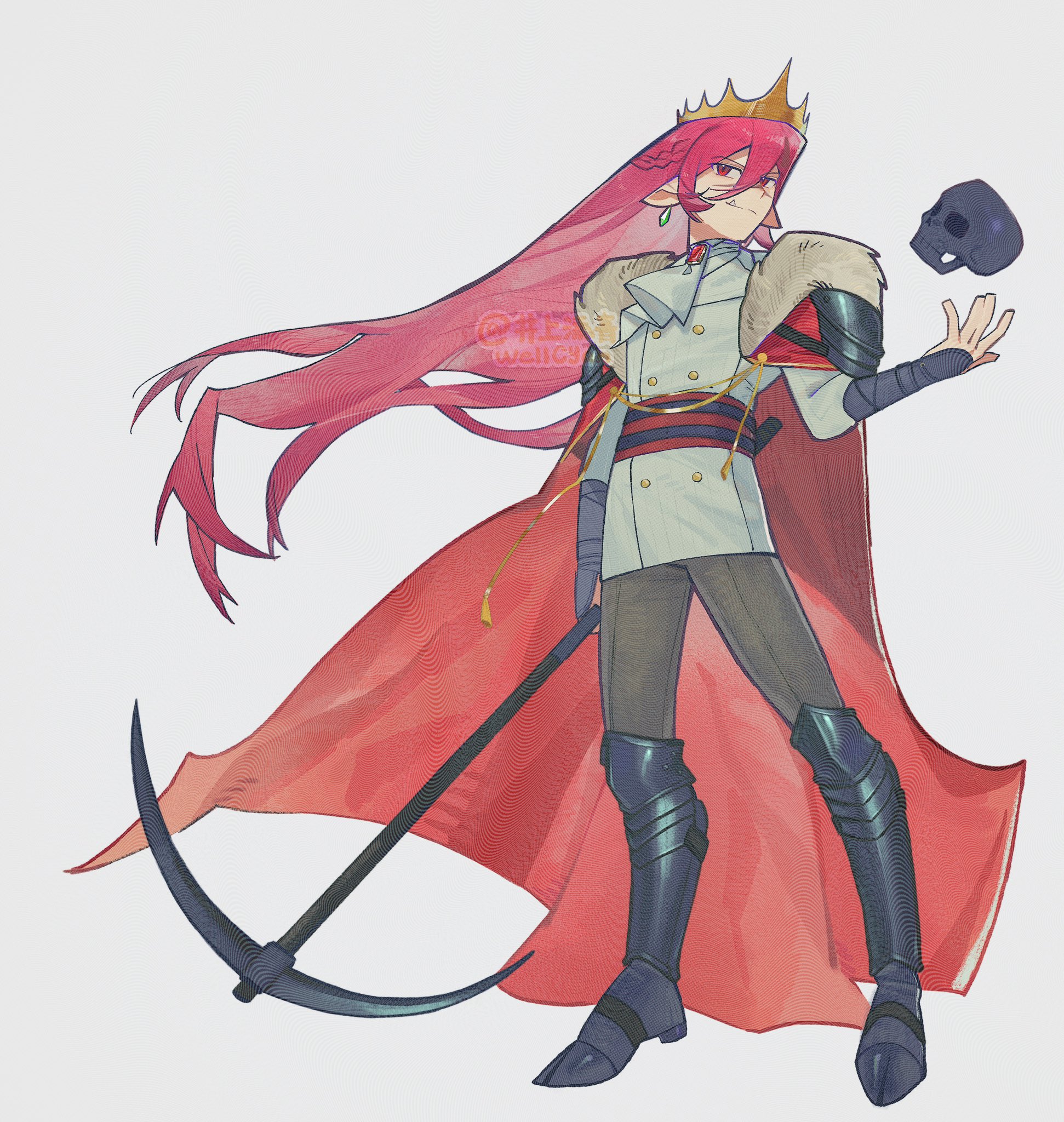 1boy androgynous animification armored_boots ascot belt bishounen boots braid brooch brown_pants buttons cape coat commentary crown dream_smp earrings english_commentary fang floating_hair full_body fur-trimmed_cape fur_trim gold_crown hair_between_eyes half_up_braid highres holding holding_pickaxe humanization jewelry long_hair long_sleeves looking_at_viewer male_focus minecraft minecraft_youtube pants pickaxe pink_hair pointed_crown pointy_ears red_belt red_cape red_eyes scar scar_on_face scar_on_nose shirt single_earring skull solo standing technoblade very_long_hair watermark wellcyan white_ascot white_coat wither_skull