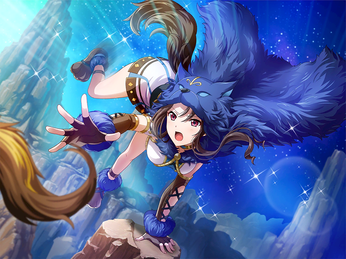 1girl akikaze_rui black_hair brown_gloves dress elbow_gloves fake_tail fingerless_gloves fur_(clothing) game_cg gloves looking_at_viewer official_art open_mouth reaching red_eyes shoujo_kageki_revue_starlight shoujo_kageki_revue_starlight_-re_live- sidelocks solo sparkle tail white_dress wolf_hood wolf_tail