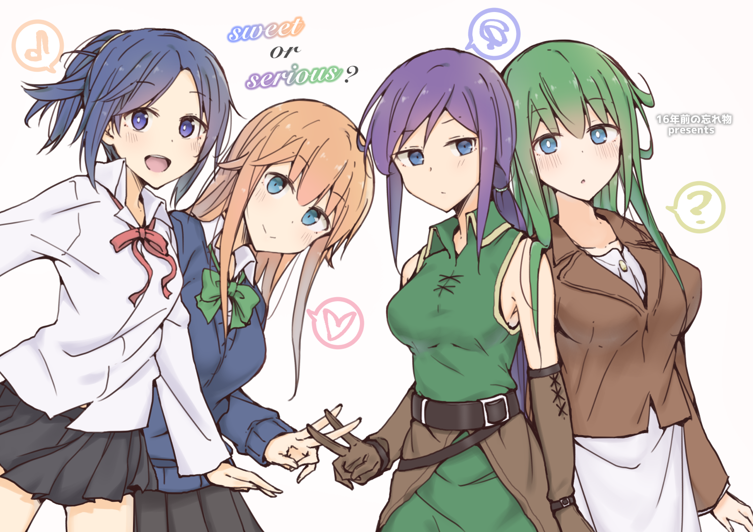 4girls ? amatsuki_isuzu belt black_skirt blue_cardigan blue_eyes blue_hair bow bowtie brown_belt brown_coat brown_gloves cardigan closed_mouth coat commentary_request eighth_note elbow_gloves english_text gloves green_bow green_bowtie green_hair green_shirt green_skirt heart hidarite_no_hoosoku_(tdog) high_ponytail jikkyou_powerful_pro_yakyuu kamiki_yui kirishima_rena long_hair looking_at_viewer low_ponytail multiple_girls musical_note neck_ribbon nozaki_iori open_mouth orange_hair ponytail power_pro_kun_pocket power_pro_kun_pocket_10 power_pro_kun_pocket_12 power_pro_kun_pocket_4 power_pro_kun_pocket_7 power_pro_kun_pocket_9 purple_eyes purple_hair red_ribbon ribbon school_uniform shirt short_hair skirt spoken_heart spoken_question_mark spoken_squiggle squiggle translation_request v white_background white_shirt white_skirt