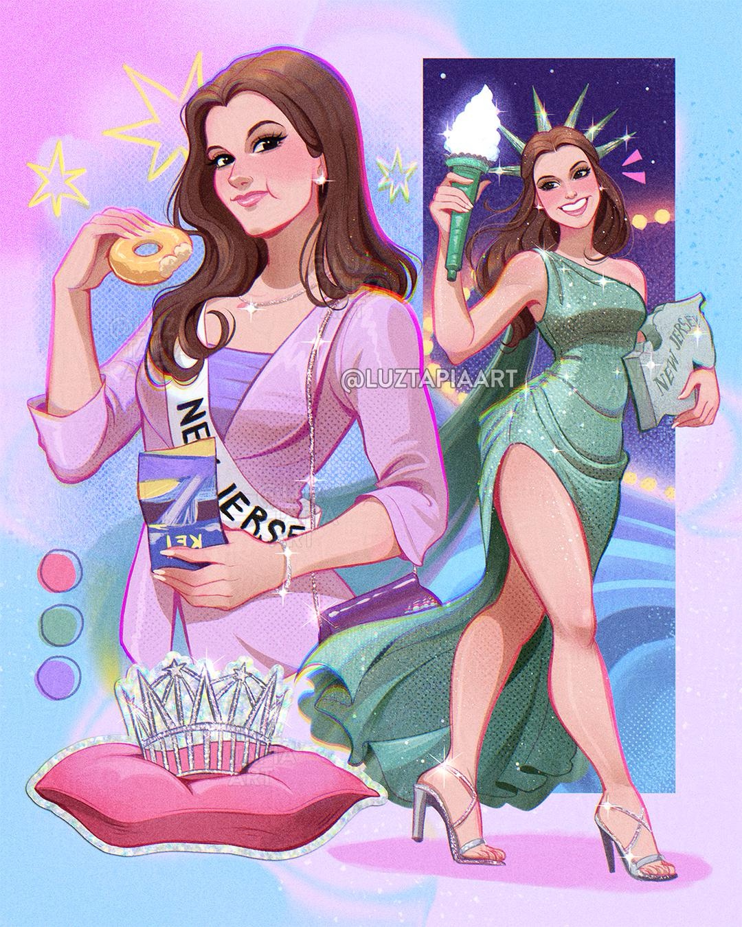 1girl aqua_dress brown_eyes brown_hair commentary cosplay crown cushion donut dress english_commentary food gracie_hart high_heels highres holding holding_donut holding_food jacket long_hair looking_at_viewer luztapiaart miss_congeniality multiple_views pink_jacket sleeveless sleeveless_dress