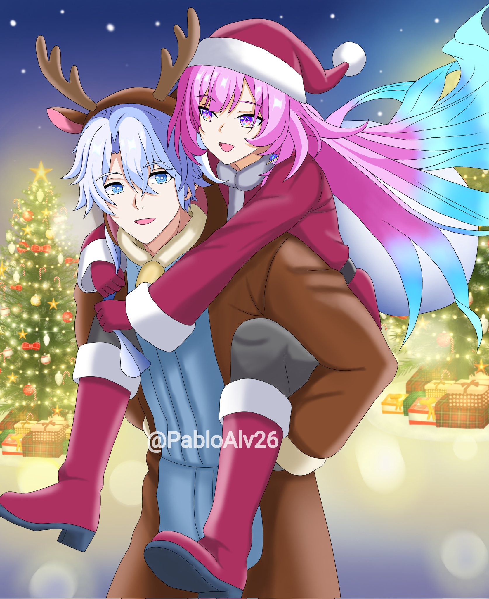 1boy 1girl animal_costume animal_ears animal_hood antlers blue_eyes blue_hair boots carrying christmas_tree commentary curtained_hair cyrene_(honkai:_star_rail) deer_ears earrings english_commentary fake_antlers floating_hair fur-trimmed_boots fur-trimmed_headwear fur-trimmed_sleeves fur_trim gift gloves hair_between_eyes hat highres holding holding_sack honkai:_star_rail honkai_(series) hood horns jewelry long_hair multicolored_hair open_mouth outdoors pablo_alvarado parted_bangs phainon_(honkai:_star_rail) piggyback pink_hair red_gloves reindeer_antlers reindeer_costume reindeer_hood sack santa_costume santa_hat short_hair single_earring smile snow snowing streaked_hair twitter_username white_hair