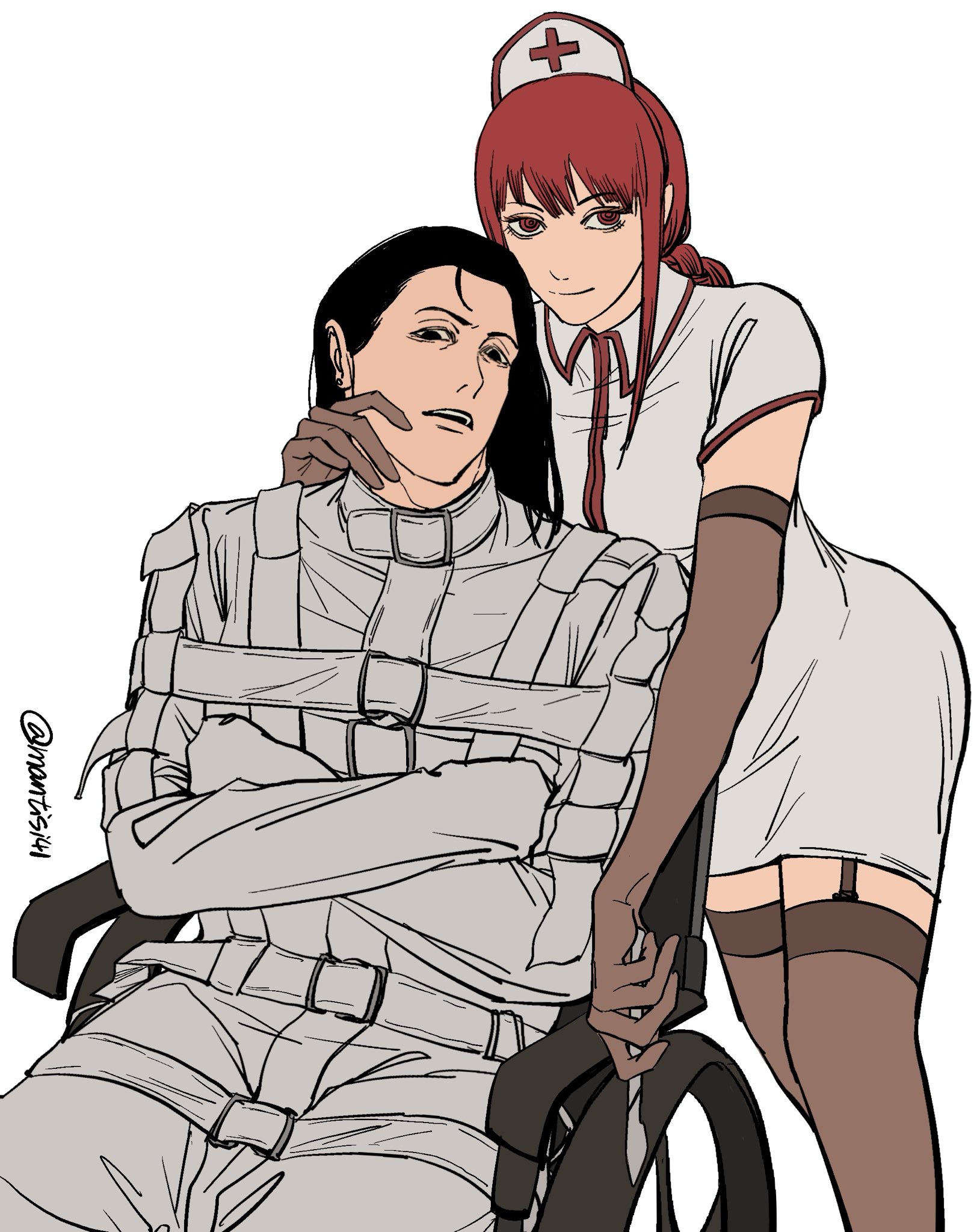 1boy 1girl barem_(chainsaw_man) black_eyes black_hair bound bound_arms braid braided_ponytail chainsaw_man collared_dress commentary dress elbow_gloves english_commentary gloves hand_on_another's_face hat highres long_hair looking_at_viewer makima_(chainsaw_man) mantisi41 nurse nurse_cap red_eyes red_hair ringed_eyes straitjacket wheelchair white_background white_dress
