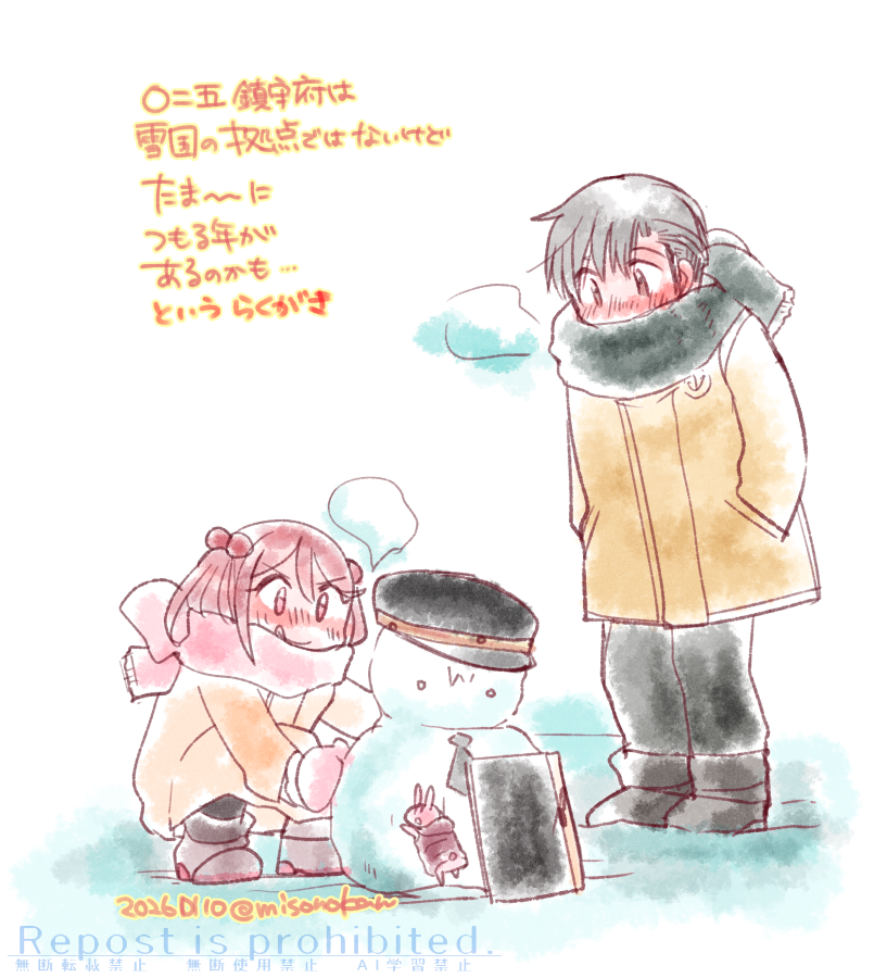 1boy 1girl admiral_(kancolle) breath commentary_request dated green_scarf izumiyamisono kantai_collection pink_scarf rabbit sazanami_(kancolle) scarf simple_background snowman squatting translation_request twitter_username white_background winter_clothes