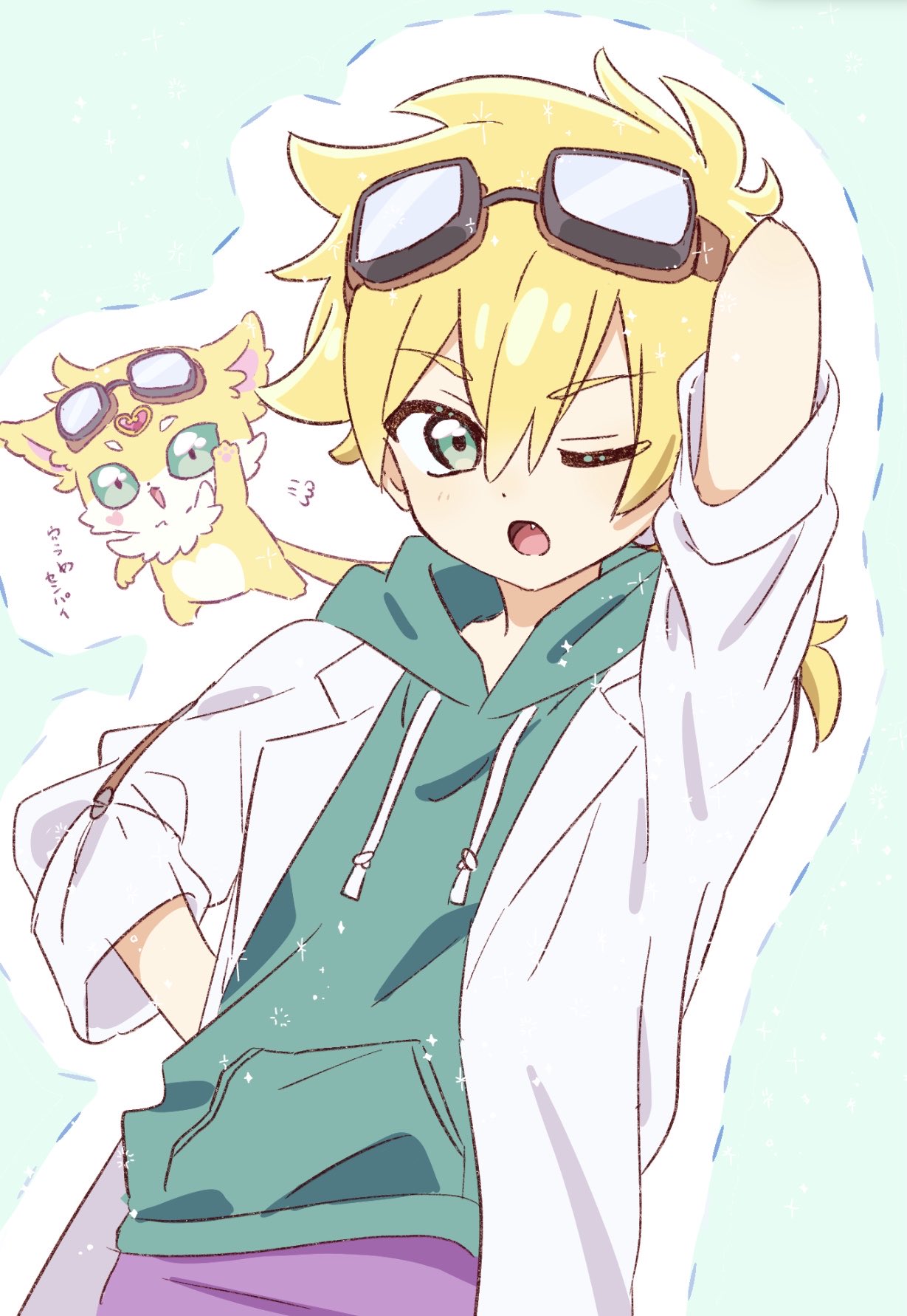 1boy commentary double-parted_bangs fang goggles green_background green_eyes green_sweater hand_in_pocket highres jett_(precure) lab_coat light_blush looking_at_viewer meitantei_precure! one_eye_closed open_mouth ponytail precure purple_shorts short_sleeves shorts sweater usiusi_nanas