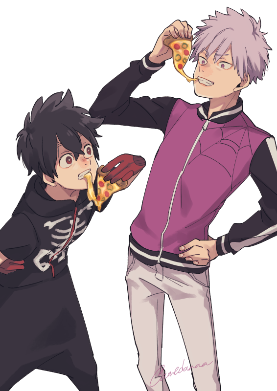 2boys amedaaaa black_hair cropped_legs food gloves hand_on_own_hip holding holding_food hood hooded_jacket jacket kemono_jihen kusaka_kabane male_focus multiple_boys pizza pizza_slice purple_eyes red_eyes red_gloves short_hair skeleton_print tademaru_shiki teeth upper_body white_background
