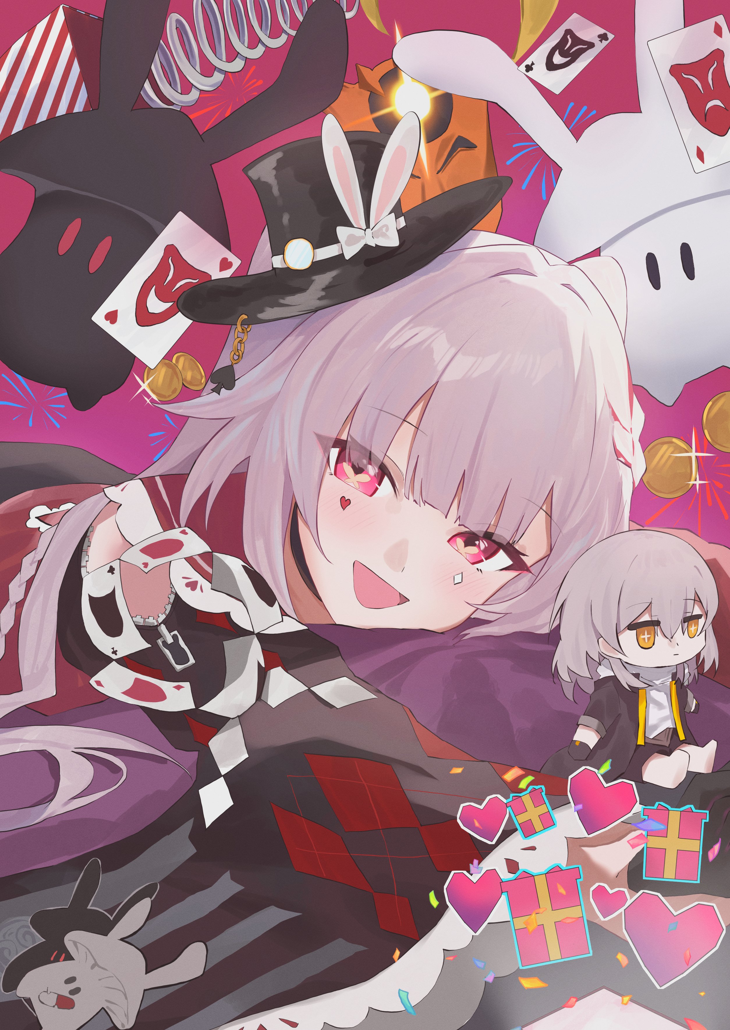 1girl :d absurdres aha_(honkai:_star_rail) black_hat butterfly-shaped_pupils character_doll clothing_cutout coin commentary_request diamond_(shape) diamond_facial_mark doll evening_rabbit facial_mark gift grey_hair hat heart heart_facial_mark highres honkai:_star_rail honkai_(series) long_hair looking_at_viewer open_mouth red_eyes shoulder_cutout smile solo sparkle_(honkai:_star_rail) sparxie_(honkai:_star_rail) stelle_(honkai:_star_rail) symbol-shaped_pupils top_hat trailblazer_(honkai:_star_rail) twintails