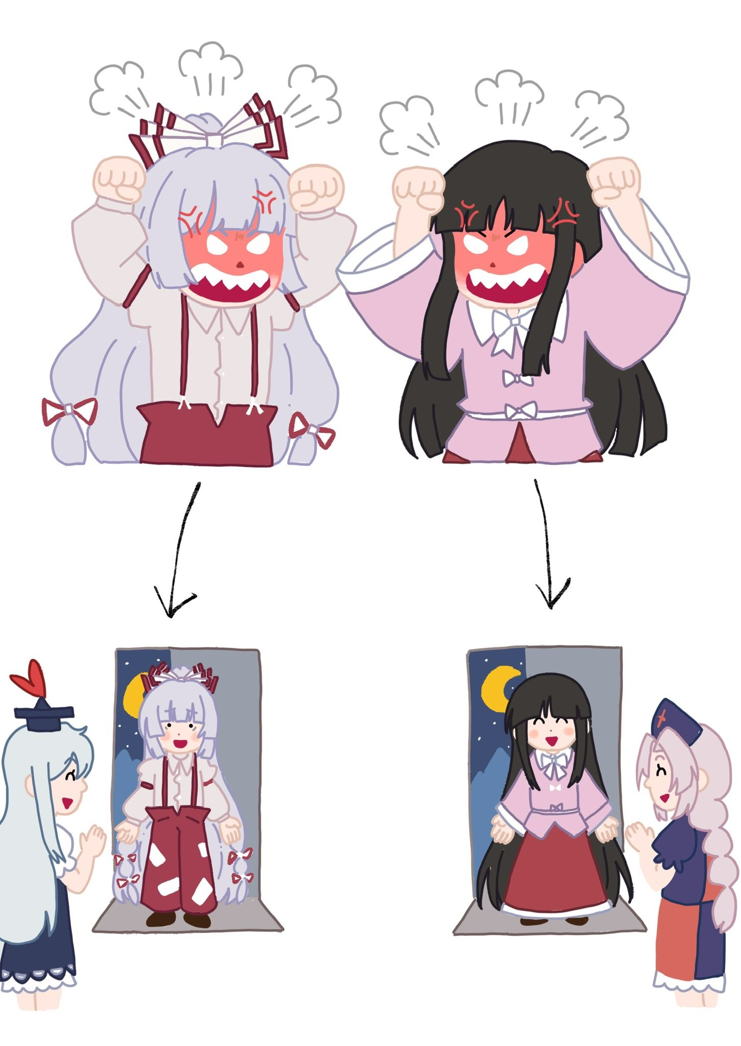 4girls anger_vein arrow_(symbol) black_hair blue_dress blue_hat blunt_bangs bow dress fujiwara_no_mokou grey_hair hair_bow hashtag-only_commentary hat highres hime_cut houraisan_kaguya kamishirasawa_keine long_hair meme multiple_girls pink_shirt puff_of_air red_skirt sharp_teeth shirt skirt suspenders teeth touhou tsukira_kira yagokoro_eirin
