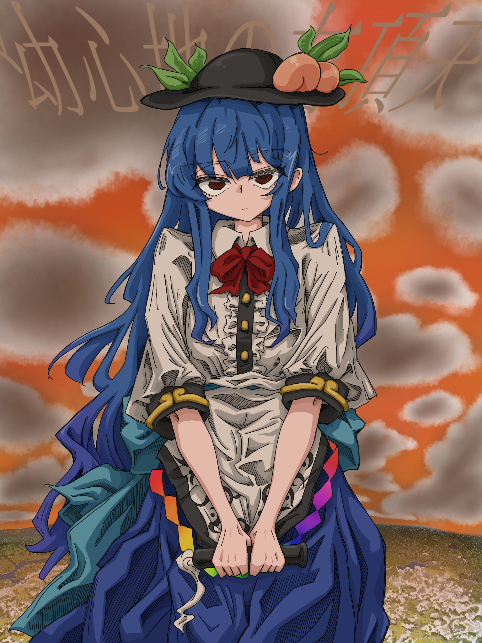 1girl barikin_tenshi black_hat blue_hair blue_skirt bow bowtie center_frills closed_mouth cloud commentary_request frills hat highres hinanawi_tenshi holding holding_sword holding_weapon long_hair looking_at_viewer orange_sky outdoors peach_hat_ornament rainbow_order red_bow red_bowtie red_eyes shirt short_sleeves sitting skirt sky solo sword sword_of_hisou touhou variant_set very_long_hair weapon white_shirt