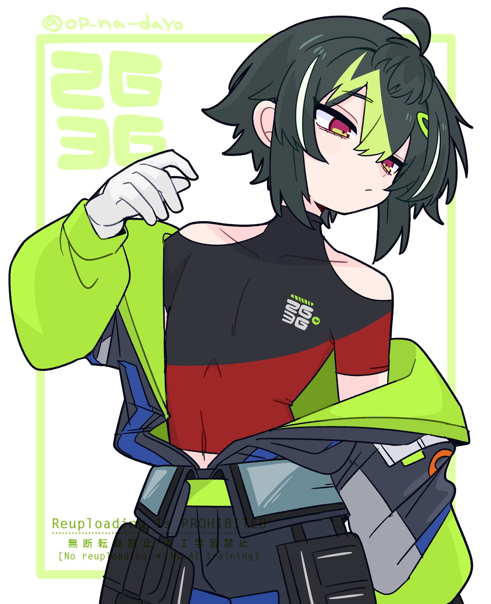 1boy adapted_costume ahoge artist_name belt_pouch black_hair black_shirt commentary_request compression_shirt covered_collarbone covered_navel cowboy_shot gloves green_hair hair_between_eyes hair_ornament hairclip head_tilt highres inami_rai jacket looking_down looking_to_the_side male_focus messy_hair multicolored_hair multicolored_jacket multicolored_pants nijisanji op_na_yarou pants pouch red_eyes red_shirt shirt sidelocks solo streaked_hair virtual_youtuber white_gloves