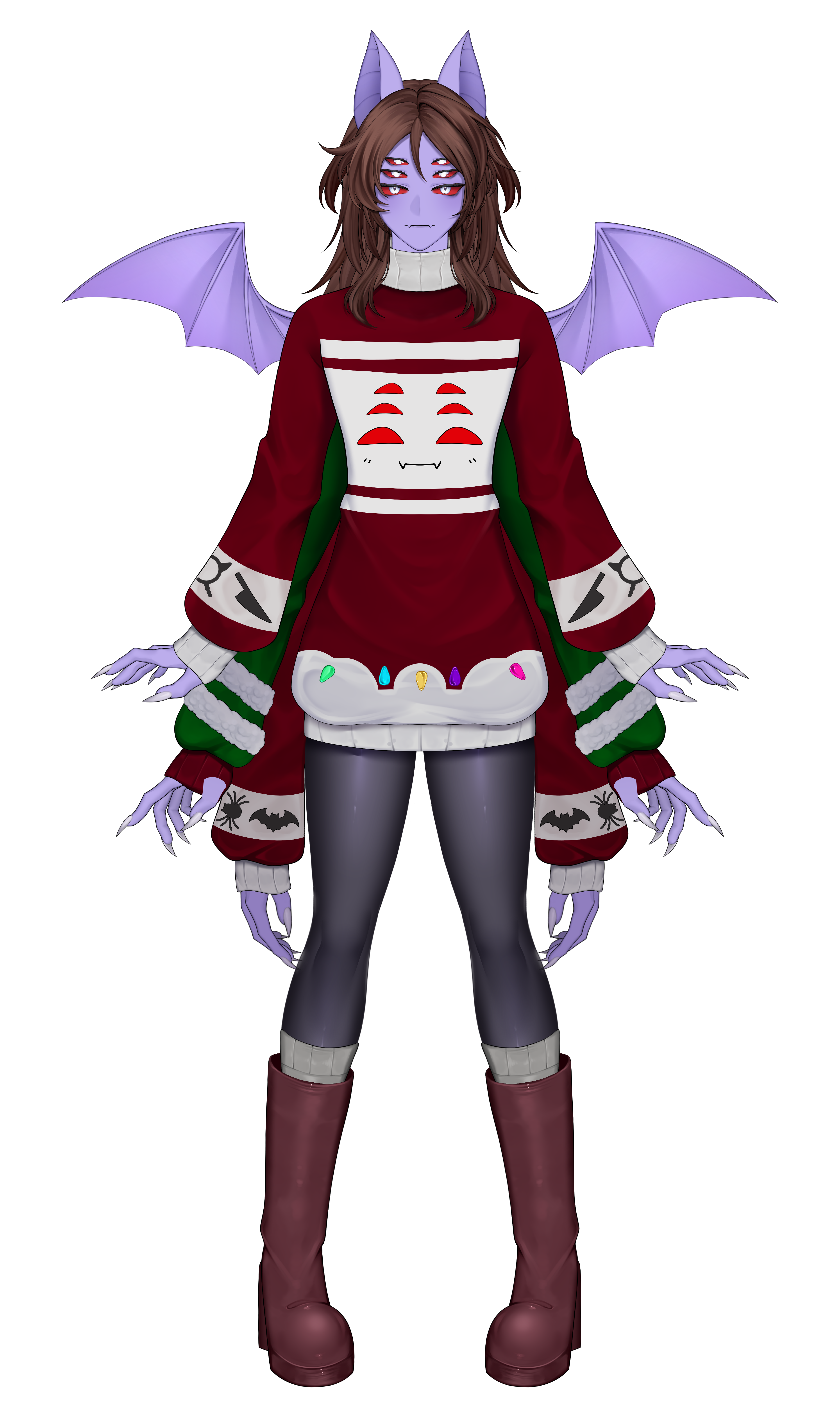absurdres animal_ears animal_print bat_boy bat_ears bat_print boots brown_boots brown_hair colored_sclera colored_skin dante_will dante_will_(bat) dante_will_(christmas) extra_arms extra_eyes fingernails highres kiranni1 knife_print long_hair long_sleeves neobaka ohwasuy purple_skin red_sclera red_sweater sharp_fingernails smile socks spider_print sweater wings
