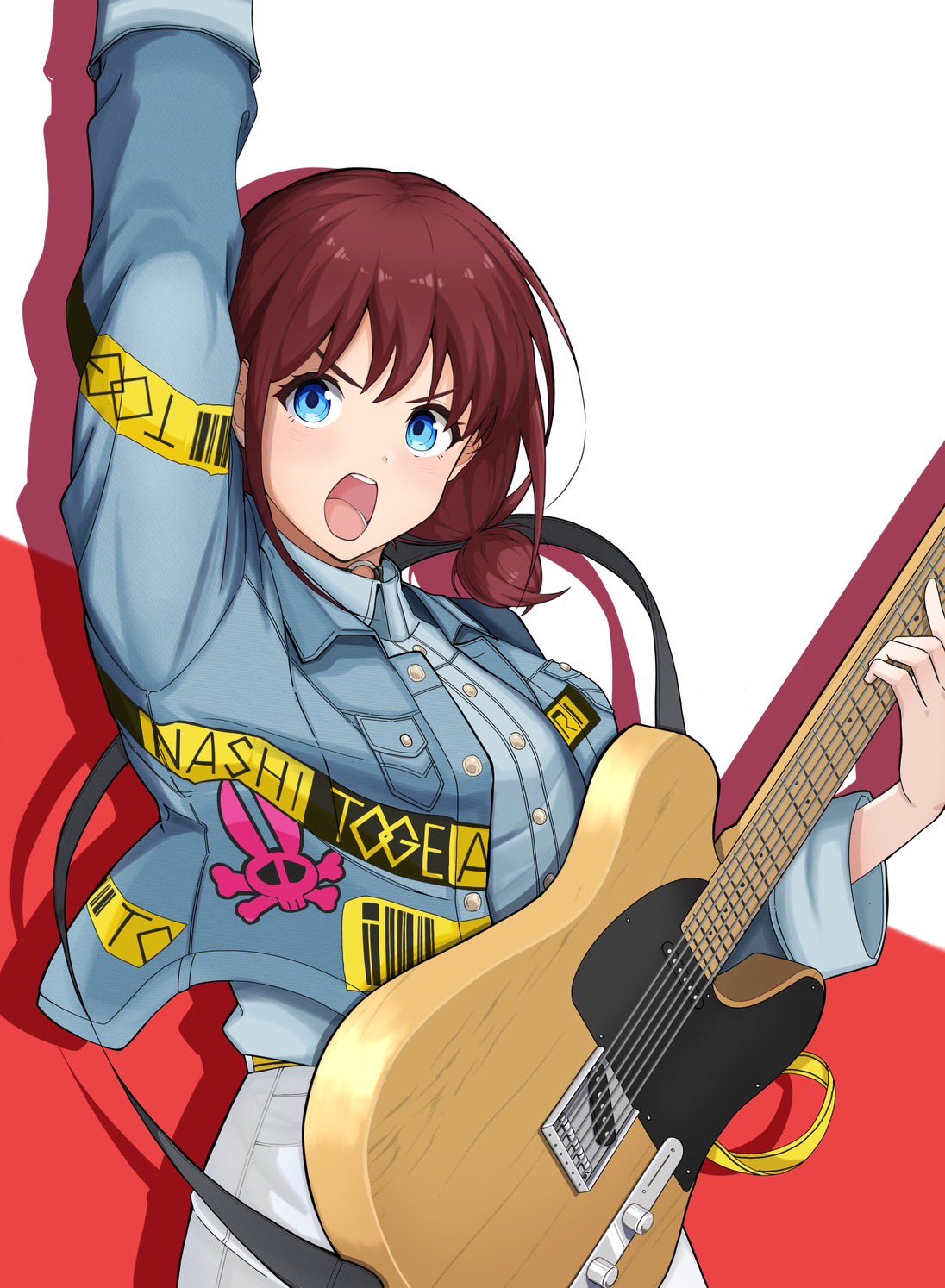 1girl arm_up blue_eyes blue_shirt buttons choker collared_shirt commentary_request denim denim_jacket drop_shadow electric_guitar fender_stratocaster girls_band_cry guitar guitar_strap highres holding holding_guitar holding_instrument instrument iseri_nina jacket long_sleeves low_twintails ngn_mahiro o-ring o-ring_choker open_mouth red_background red_hair shirt short_hair short_twintails shorts solo twintails two-tone_background upper_body v-shaped_eyebrows white_background white_shorts