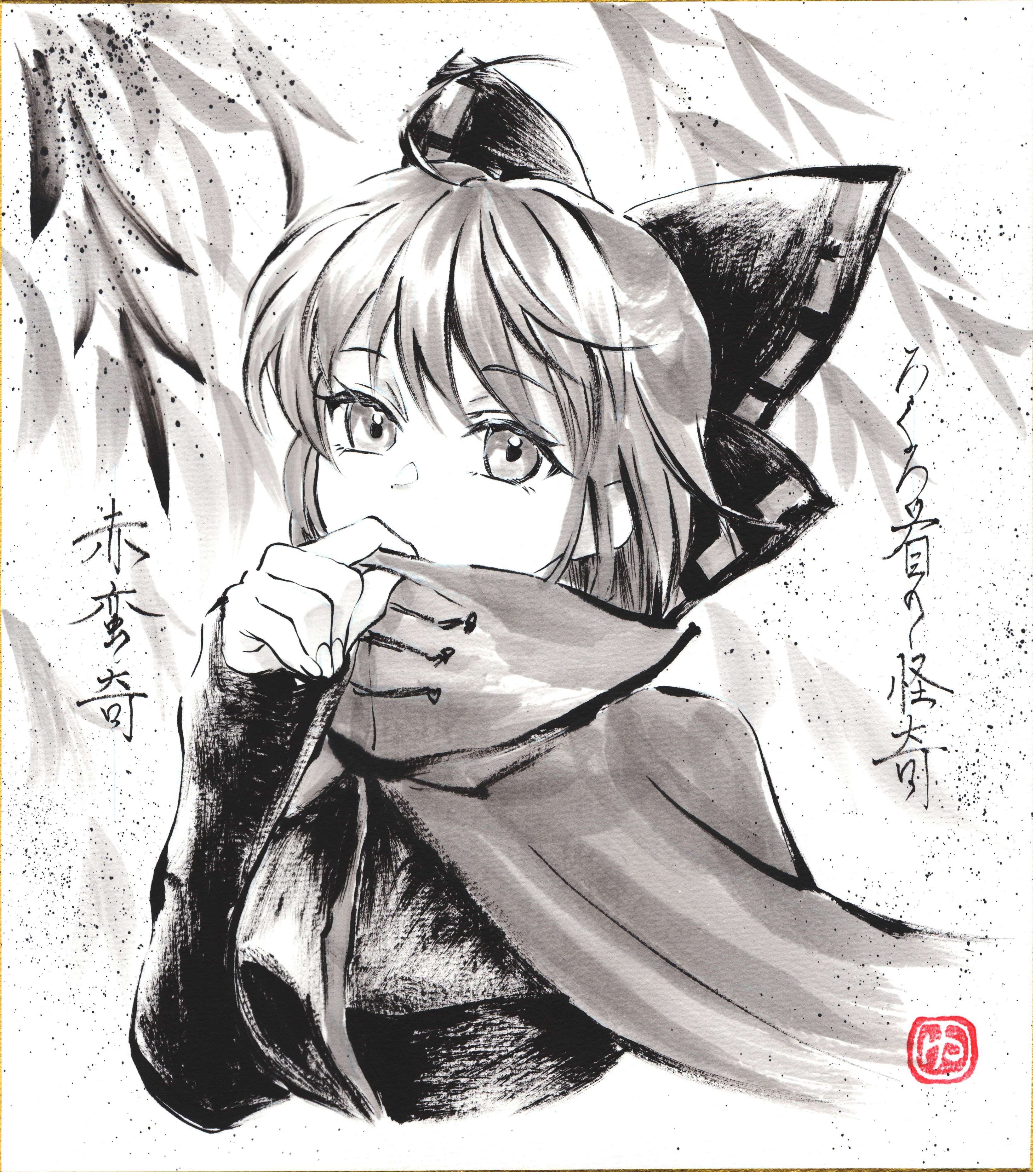 1girl absurdres bow cloak commentary_request greyscale hair_bow highres long_sleeves medium_hair monochrome ribbon-trimmed_bow ribbon_trim sekibanki shikishi shirt solo sumi-e touhou traditional_media translation_request upper_body yuzuha_(yuzutime)