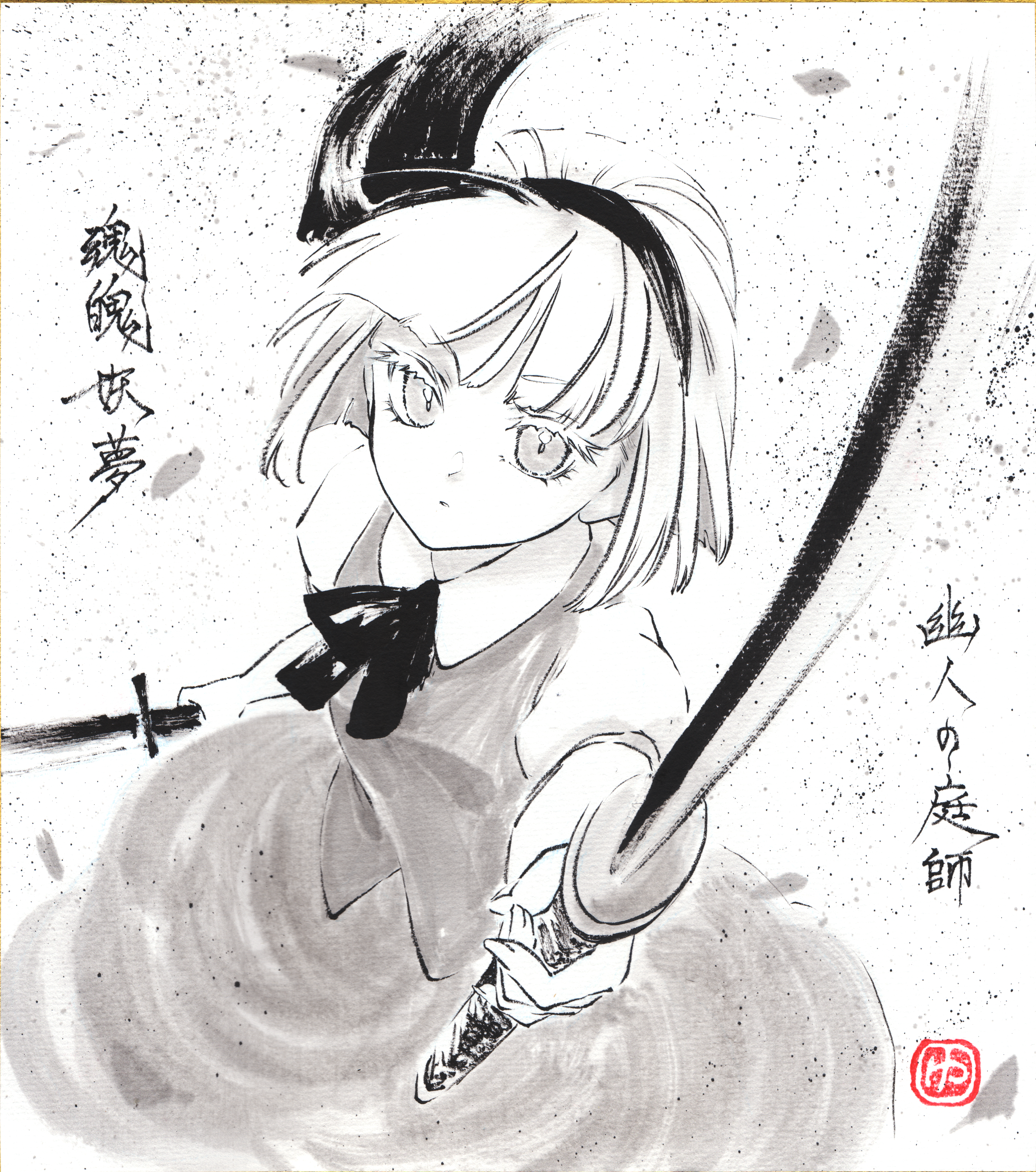 1girl absurdres bow bowtie closed_mouth collared_shirt commentary_request dual_wielding falling_petals greyscale hairband highres holding holding_sword holding_weapon katana konpaku_youmu looking_at_viewer monochrome petals puffy_short_sleeves puffy_sleeves shikishi shirt short_sleeves skirt solo sumi-e sword touhou traditional_media translation_request vest weapon yuzuha_(yuzutime)