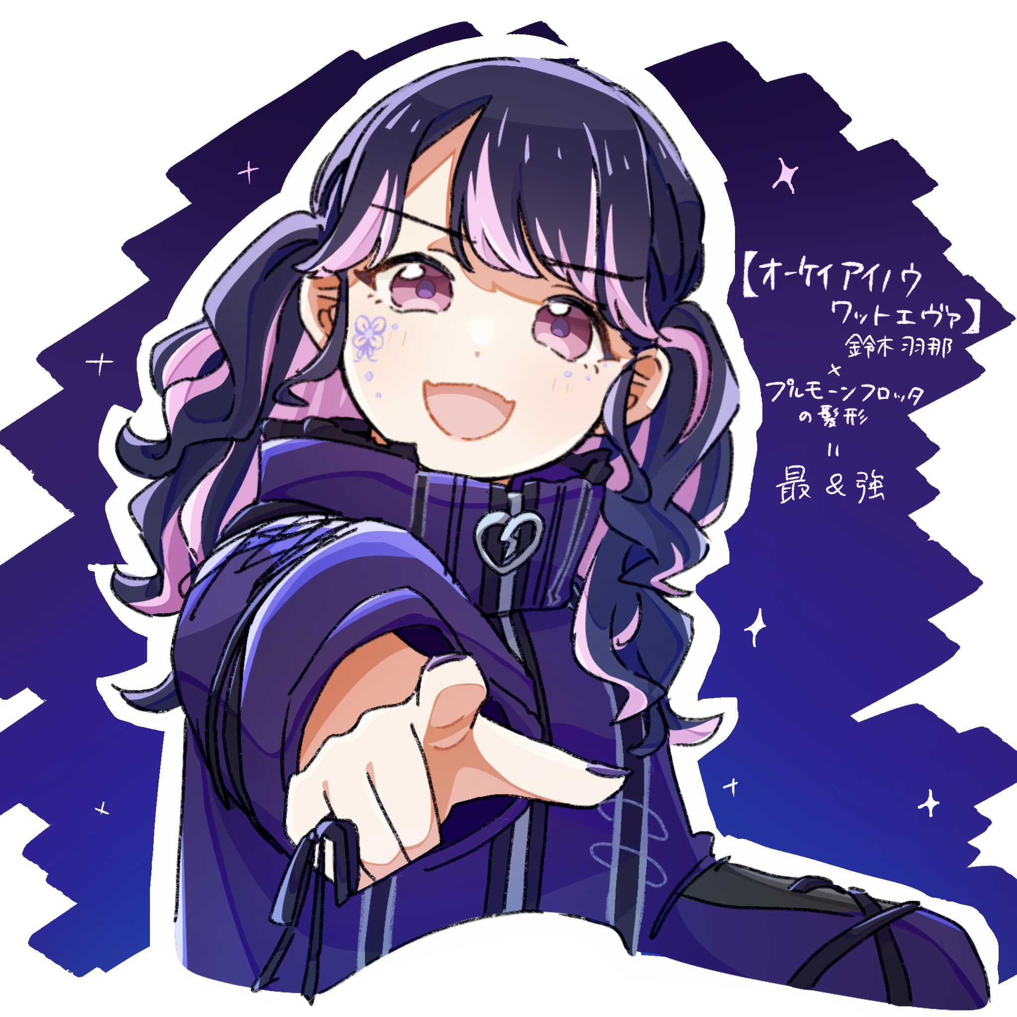 1girl black_hair blue_background commentary_request fukumaru_koito gradient_background highres idolmaster idolmaster_shiny_colors jacket long_hair long_sleeves looking_at_viewer multicolored_hair nail_polish open_mouth pink_eyes pink_hair pointing pointing_at_viewer purple_jacket purple_nails solo sticker sticker_on_face streaked_hair translation_request twintails two-tone_hair upper_body yuumaru_(awhc7334)