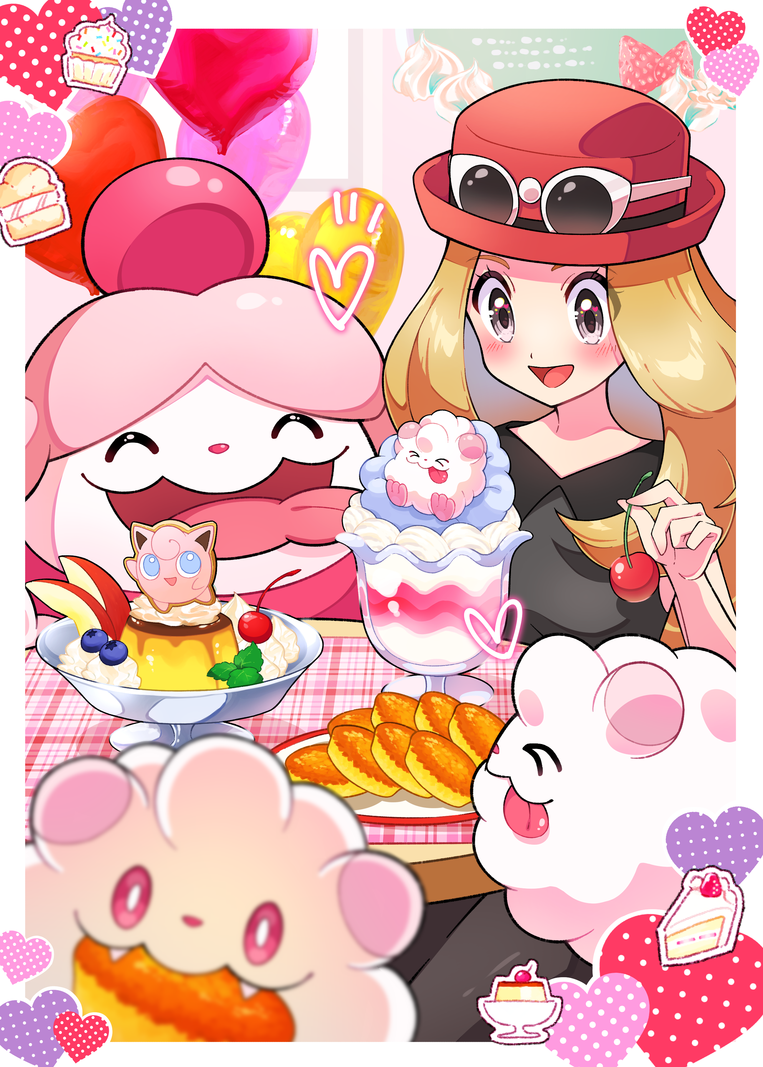 1girl :d absurdres balloon blonde_hair blurry blurry_foreground blush cherry collared_shirt commentary_request dessert eyewear_on_headwear food fruit gen_1_pokemon gen_6_pokemon happy hat heart highres holding jigglypuff long_hair looking_down nintendo open_mouth plate pokemon pokemon_(creature) pokemon_xy pon_yui red_hat serena_(pokemon) shirt slurpuff smile sunglasses swirlix table tongue