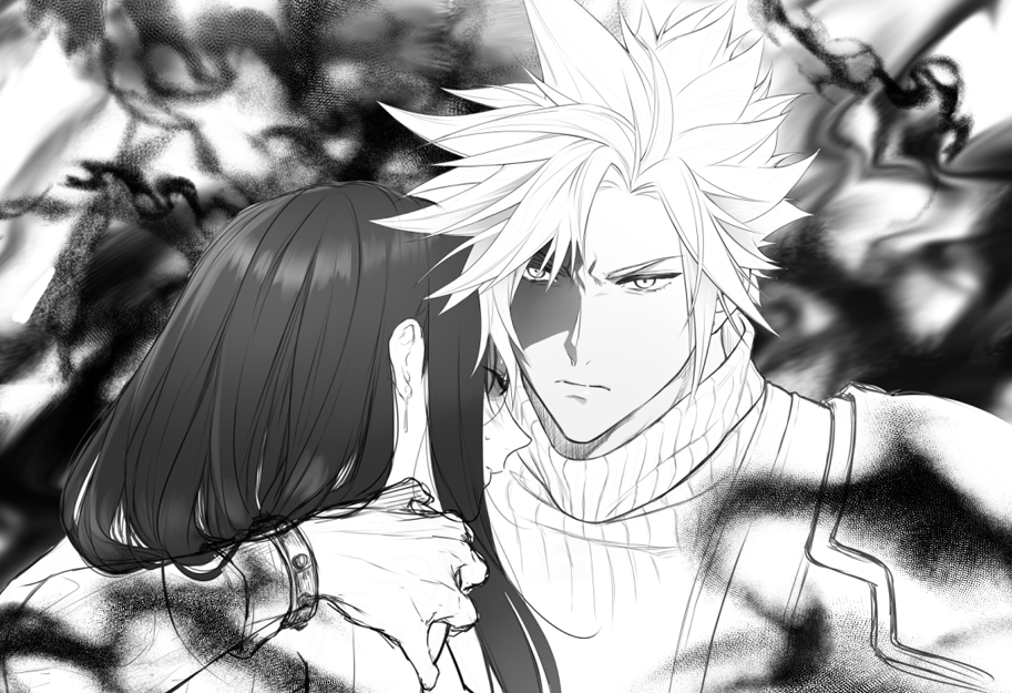 1boy 1girl arm_around_shoulder armor black_hair closed_eyes closed_mouth cloud_strife commentary_request earrings final_fantasy final_fantasy_vii final_fantasy_vii_remake greyscale hand_on_another's_shoulder jewelry leaning_on_person long_hair looking_at_viewer minatoyatonami monochrome ribbed_sweater serious shaded_face short_hair shoulder_armor sleeveless sleeveless_turtleneck spiked_hair sweater tifa_lockhart turtleneck turtleneck_sweater upper_body