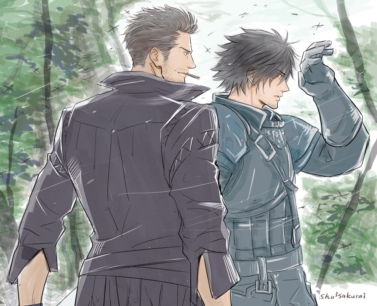 2boys armor artist_name beard_stubble black_gloves black_shirt cidolfus_telamon cigar clive_rosfield facial_hair facing_to_the_side final_fantasy final_fantasy_xvi forest gloves hair_between_eyes hair_slicked_back hashtag-only_commentary male_focus multiple_boys nature outdoors profile sakurai_shushushu shielding shirt short_hair shoulder_armor sideburns stubble upper_body wind