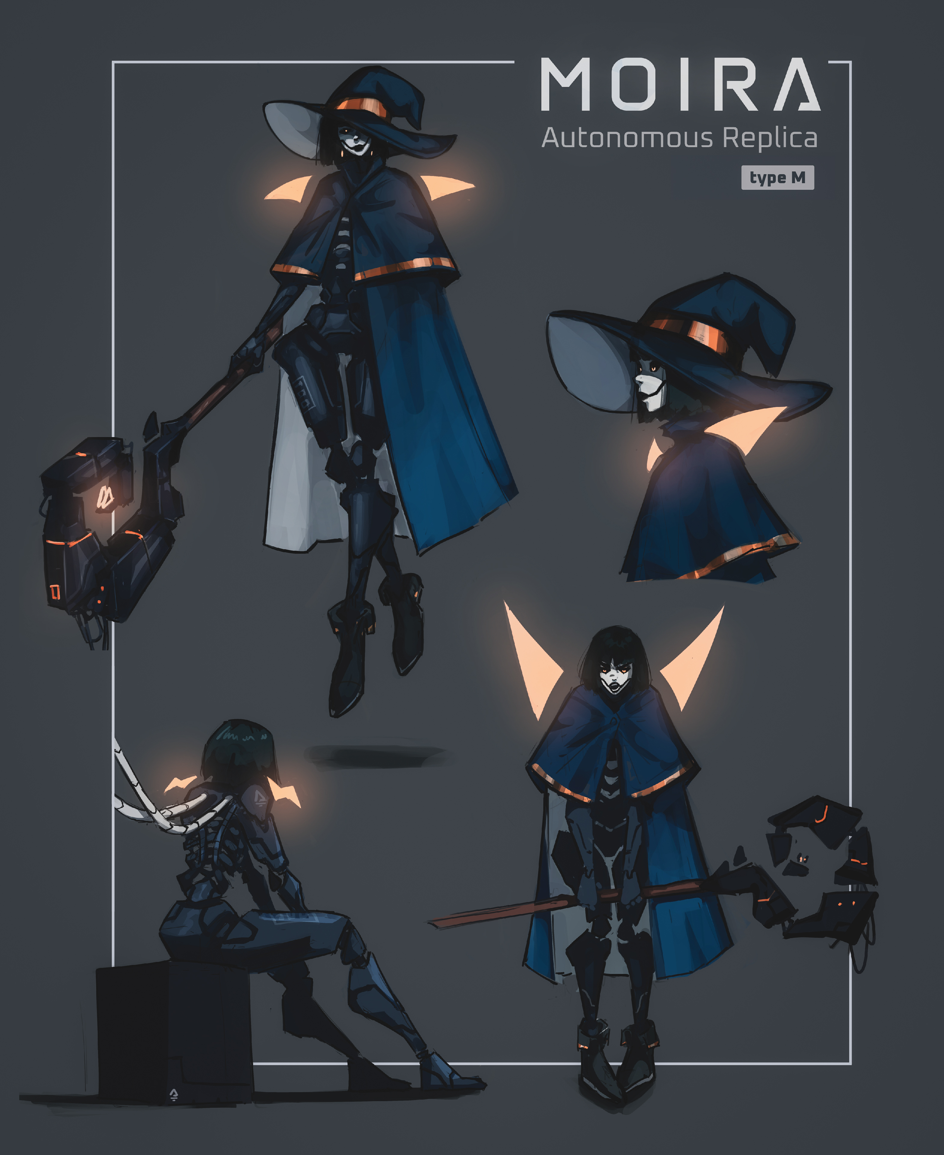 1girl absurdres android black_hair blue_cape blue_hat cable cape closed_mouth commentary english_commentary floating grey_background hat highres holding holding_staff inset_border multiple_views open_mouth original short_hair sitting staff titanartx triangle witch witch_hat yellow_eyes