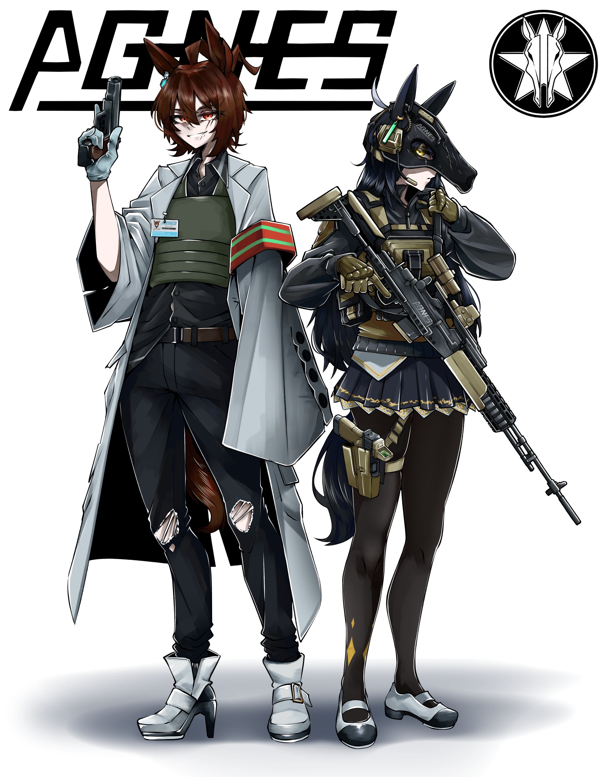 2girls absurdres agnes_tachyon_(umamusume) ahoge animal_ears assault_rifle battle_rifle belt black_coat black_hair black_pants black_pantyhose black_skirt boots brown_hair bulletproof_vest chemical_structure closed_mouth coat collared_shirt commentary docileart ear_tag earrings ears_through_headwear english_commentary glock gloves grin gun hair_between_eyes handgun helmet highres holding holding_gun holding_weapon horse_ears horse_girl horse_tail id_card jewelry lab_coat long_hair long_sleeves m14 makarov_pm manhattan_cafe_(creeping_shadow)_(umamusume) manhattan_cafe_(umamusume) medium_hair mk_14_ebr multicolored_hair multiple_girls necktie pants pantyhose parted_lips red_eyes rifle shirt shoes single_earring skirt sleeves_past_fingers sleeves_past_wrists smile smirk tail teeth torn_clothes torn_pants umamusume vest visor_(armor) weapon white_boots white_hair yellow_eyes