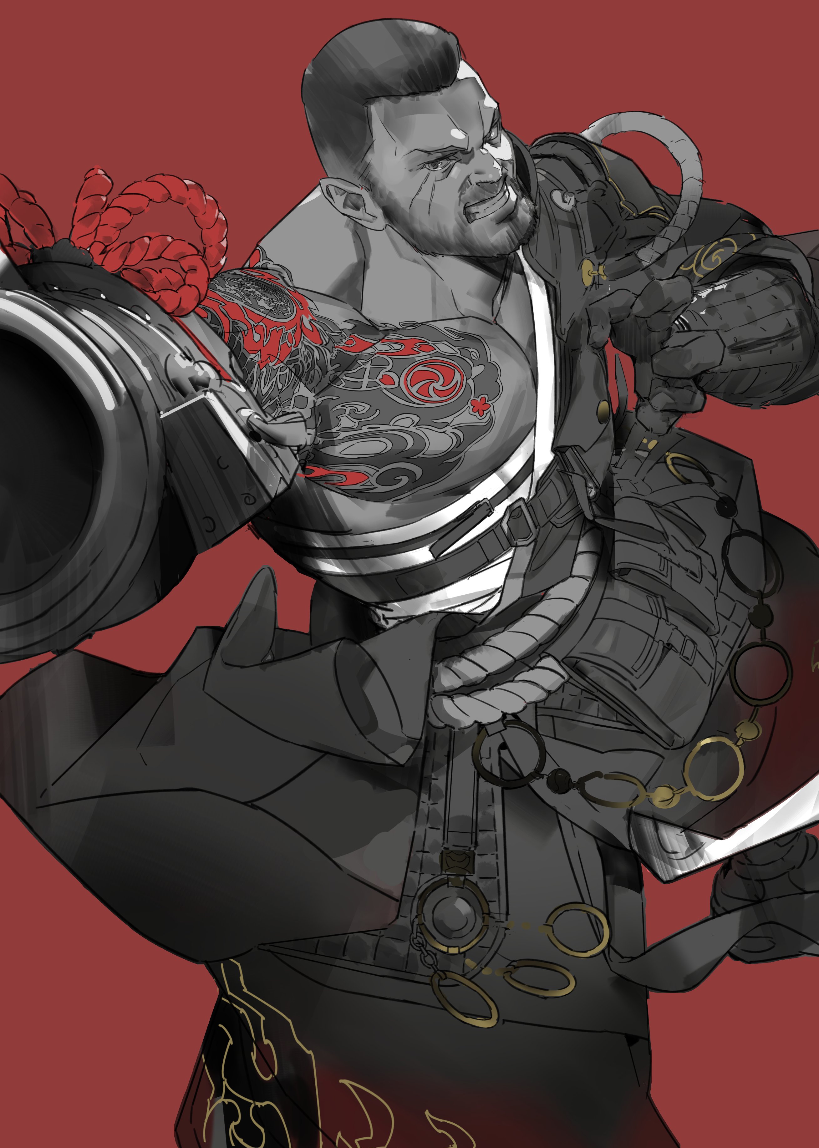 1boy absurdres aiming aiming_at_viewer arm_tattoo asymmetrical_clothes barret_wallace barret_wallace_(sunrise_hakama) beard chest_tattoo clenched_teeth commentary_request facial_hair final_fantasy final_fantasy_vii final_fantasy_vii:_ever_crisis greyscale highres japanese_clothes kaneda_(umeanzberry) kimono monochrome official_alternate_costume red_background sarashi scar scar_on_face shoulder_tattoo solo spot_color strap tattoo teeth