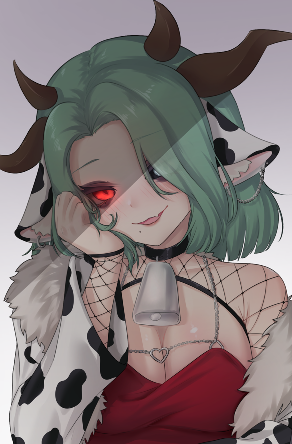 1girl animal_ears animal_print bell breasts cleavage colored_sclera commentary cow_ears cow_girl cow_horns cow_print cow_print_jacket cowbell crelly dress english_commentary fang fishnet_top fishnets green_hair grey_sclera heterochromia horns indie_virtual_youtuber jacket looking_at_viewer medium_breasts mismatched_sclera mole mole_under_mouth print_jacket red_dress red_eyes ritspi skin_fang smile virtual_youtuber