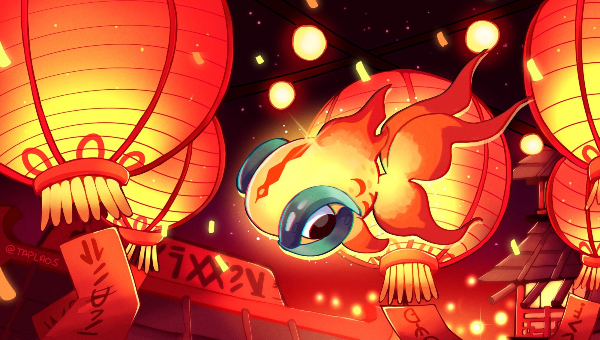 chi-yu_(pokemon) commentary fish floating goldfish highres lantern night nintendo no_humans pagoda paper_lantern pokemon pokemon_(creature) pokemon_focus pokemon_sv sky star_(sky) starry_sky symbol-only_commentary taplaos tile_roof