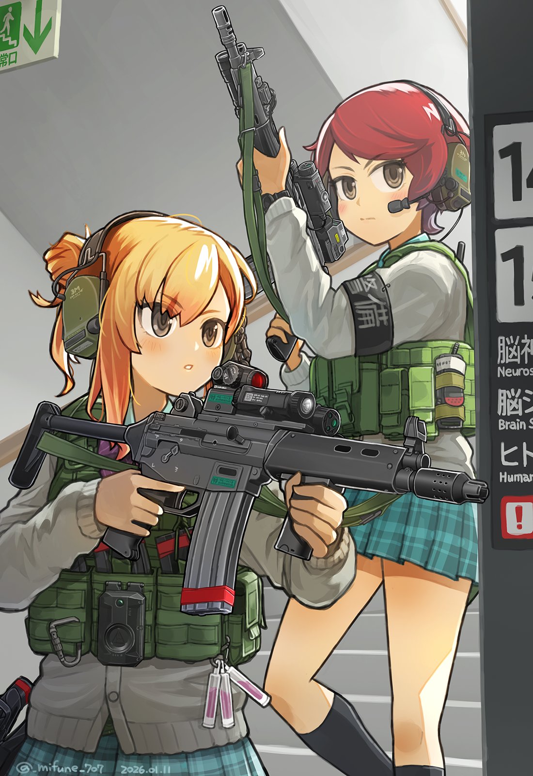 2girls ammunition_pouch ankle_socks armband artist_name assault_rifle black_armband black_socks blonde_hair blue_skirt blush brown_eyes commentary_request dated ear_protection fire_escape flashbang grey_jacket gun hair_between_eyes handgun headset highres holding holding_gun holding_weapon howa_type_89 jacket long_hair long_sleeves medium_hair microphone mifune_(_mifune_707) multiple_girls optical_sight original pleated_skirt pouch red_hair rifle school_uniform sidelocks sign signature skirt socks stairs tactical_clothes tactical_school_uniform translation_request watermark weapon