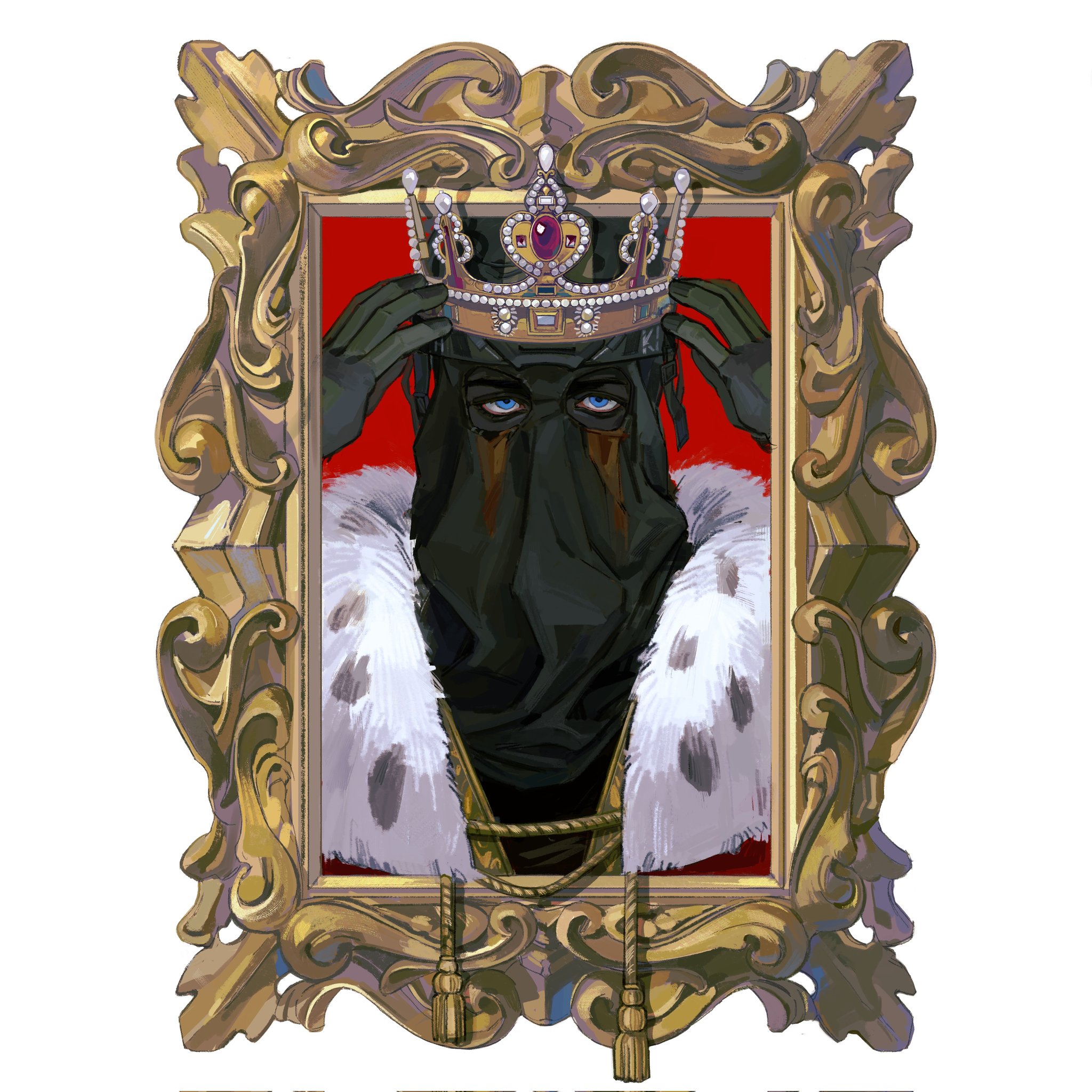 1boy black_gloves blue_eyes call_of_duty cape crown fur-trimmed_cape fur_trim gloves hand_on_own_head highres looking_at_viewer male_focus mask masked mzjn085 picture_frame pointed_crown portrait red_background red_cape simple_background solo white_background