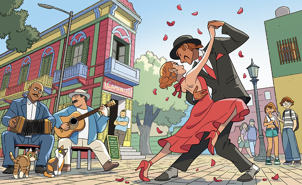 :d accordion argentina bald black_hat blue_sky brown_hair calico_(pattern) calico_cat cat commentary_request crossed_arms dancing dark_skin day dress facial_hair guitar gurihiru hair_bun hat high_heels holding_hands instrument lamppost looking_at_another multiple_boys multiple_girls music mustache open_mouth orange_hair original petals playing_guitar playing_instrument profile red_dress red_petals red_shoes rose_petals shirt shoes sky smile striped_clothes striped_shirt tan tango tree