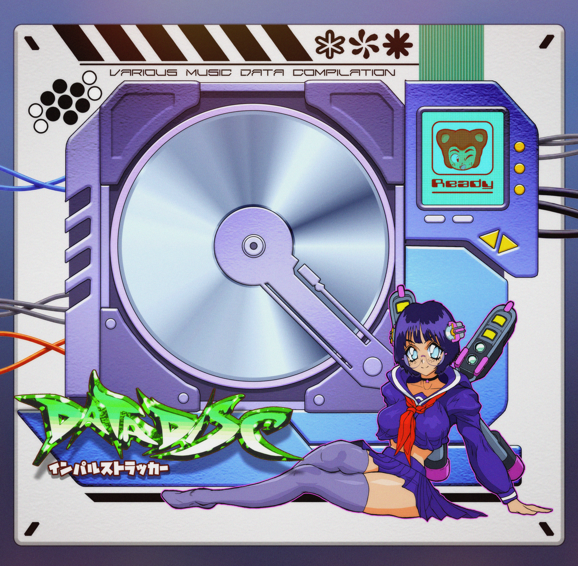 1990s_(style) 1girl :d album_cover album_name artist_logo asterisk_(symbol) blue_eyes blunt_bangs border bra breasts cable choker closed_mouth commentary cover cropped_hoodie english_commentary english_text faux_retro_artstyle full_body glasses gradient_border hair_ornament hands_on_ground hard_drive highres hood hoodie jetpack lcd logo looking_at_viewer miniskirt neckerchief no_pupils no_shoes open_mouth original outline outside_border pink_outline purple_hair purple_hoodie purple_skirt purple_thighhighs red_neckerchief retro_artstyle round_eyewear science_fiction short_hair sitting skirt smile solo speaker star_(symbol) star_choker system_st91 thighhighs thighs translation_request underwear