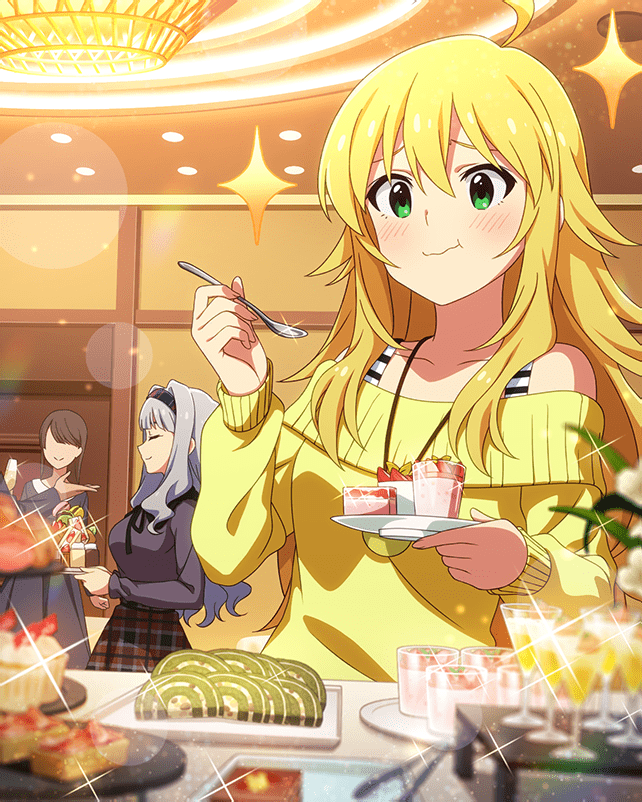 blonde_hair brown_hair card_(medium) ceiling_light cup drinking_glass faceless food game_cg green_eyes grey_hair hair_intakes hairband holding hoshii_miki idolmaster idolmaster_million_live! idolmaster_million_live!_theater_days official_art plate profile shijou_takane sparkle spoon sweater table wine_glass