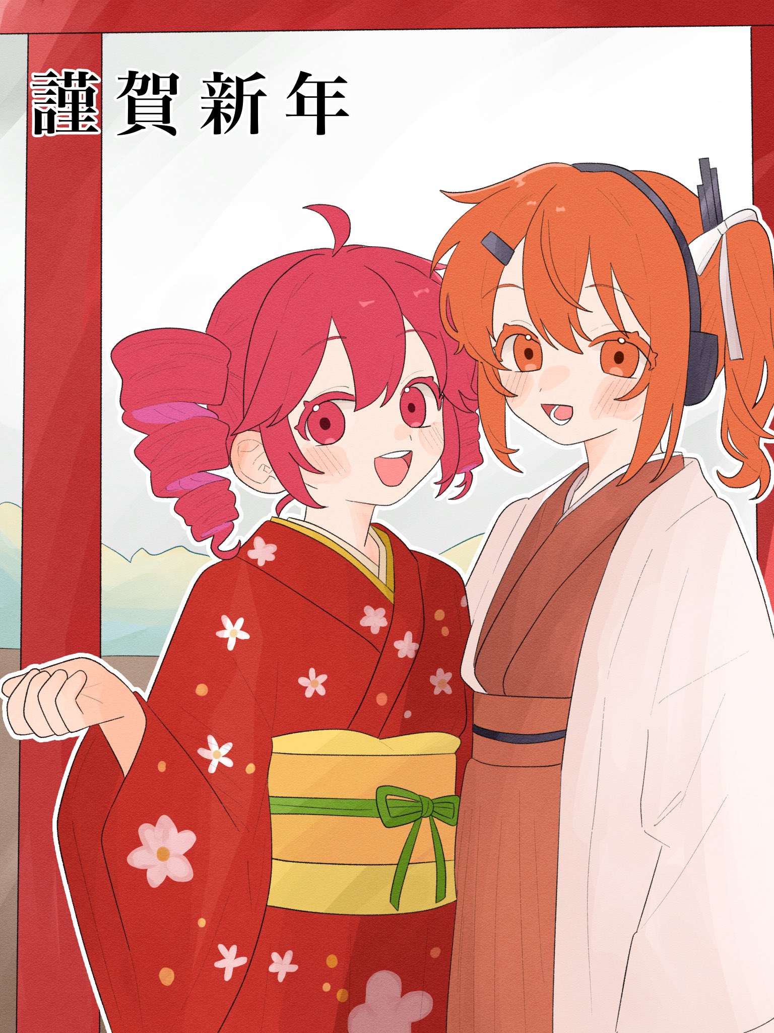 2girls a.i._voice adachi_rei ahoge alternate_costume coat commentary_request drill_hair floral_print floral_print_kimono happy_new_year highres japanese_clothes kasane_teto kimono komori_kamome looking_at_viewer multiple_girls new_year obi one_side_up open_clothes open_coat open_mouth orange_eyes orange_hair orange_kimono print_kimono red_eyes red_hair red_kimono sash smile twin_drills upper_body utau white_coat