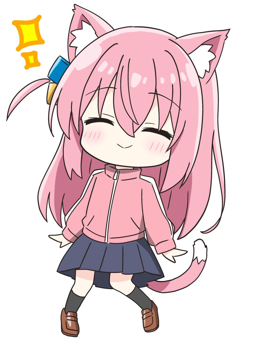1girl ^_^ animal_ear_fluff animal_ears black_socks blue_skirt blush bocchi_the_rock! brown_shoes cat_ears cat_girl cat_tail chibi chibi_only closed_eyes closed_mouth commentary_request cube_hair_ornament facing_viewer full_body gotoh_hitori hair_between_eyes hair_ornament highres jacket kemonomimi_mode kotatsu-mazoku long_hair long_sleeves one_side_up pink_hair pink_jacket pleated_skirt shoes simple_background skirt smile socks solo sparkle standing tail track_jacket white_background
