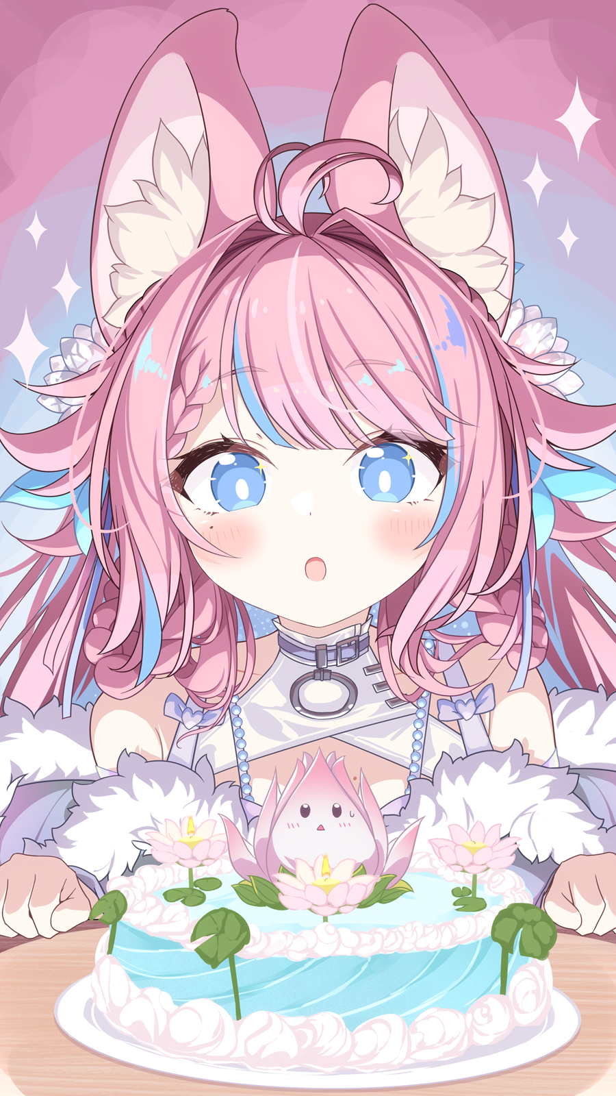 1girl :o animal_ear_fluff animal_ears bare_shoulders blue_eyes blue_hair blush braid cake commission daidai_ookami food fur-trimmed_jacket fur_trim hair_intakes highres jacket long_hair multicolored_hair original parted_lips pink_hair purple_jacket skeb_commission solo sparkle streaked_hair upper_body