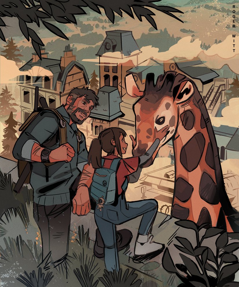 1boy 1girl arm_hair artist_name backpack bag beard black_boots black_pants blue_bag blue_pants boots brown_hair building child ellie_(the_last_of_us) facial_hair giraffe hands_on_another's_cheeks hands_on_another's_face joel_(the_last_of_us) long_hair looking_at_another mature_male outdoors pants parted_lips ponytail red_shirt rogerwitt shirt shirt_under_shirt short_hair smile the_last_of_us_(series) watch white_boots wristwatch