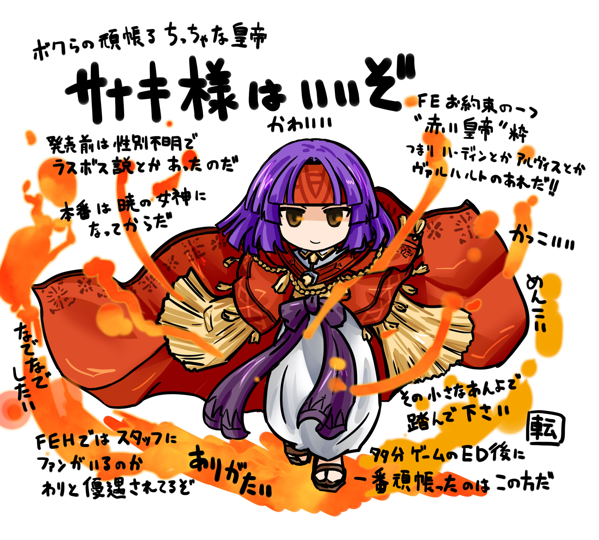 1girl brown_eyes closed_mouth commentary_request fire_emblem fire_emblem:_path_of_radiance full_body headband highres long_sleeves looking_at_viewer nintendo pants purple_hair red_headband red_robe robe sanaki_kirsch_altina sandals short_hair sleeves_past_fingers sleeves_past_wrists smile solo tenmaru translation_request white_background white_pants wide_sleeves