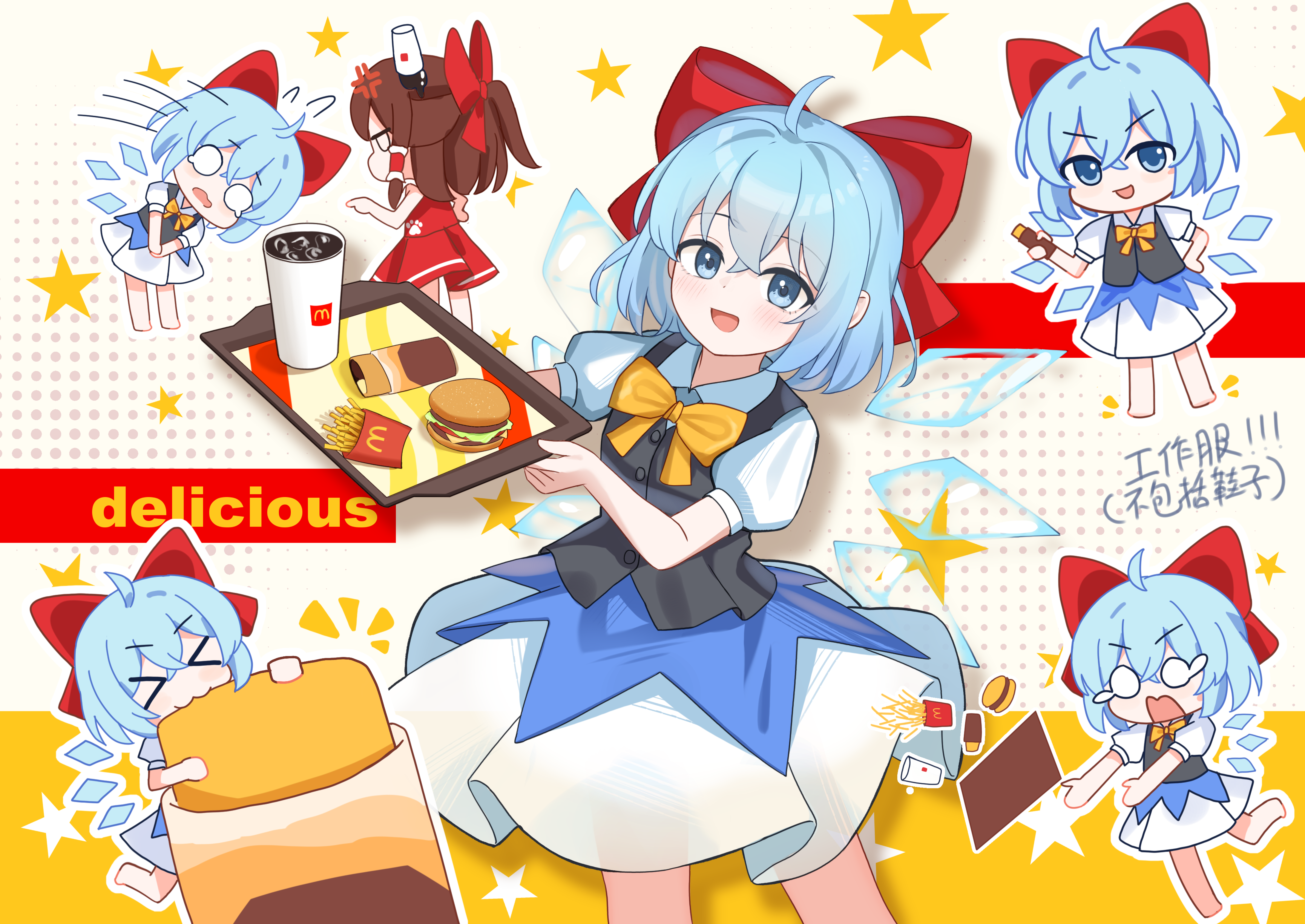 >_< 2girls absurdres alternate_costume anger_vein angry black_vest blue_dress blue_eyes blue_hair bow bowing bowtie brown_hair burger chinese_text cirno collared_shirt commentary detached_wings dress eating food french_fries frilled_hair_tubes frills hair_bow hair_tubes hakurei_reimu highres holding holding_tray ice ice_wings long_hair looking_at_viewer mcdonald's multiple_girls multiple_views open_mouth puffy_short_sleeves puffy_sleeves red_bow red_skirt shirt short_sleeves skirt skirt_set smile soda star_(symbol) touhou translation_request tray vest white_shirt wings wrainman yellow_bow yellow_bowtie